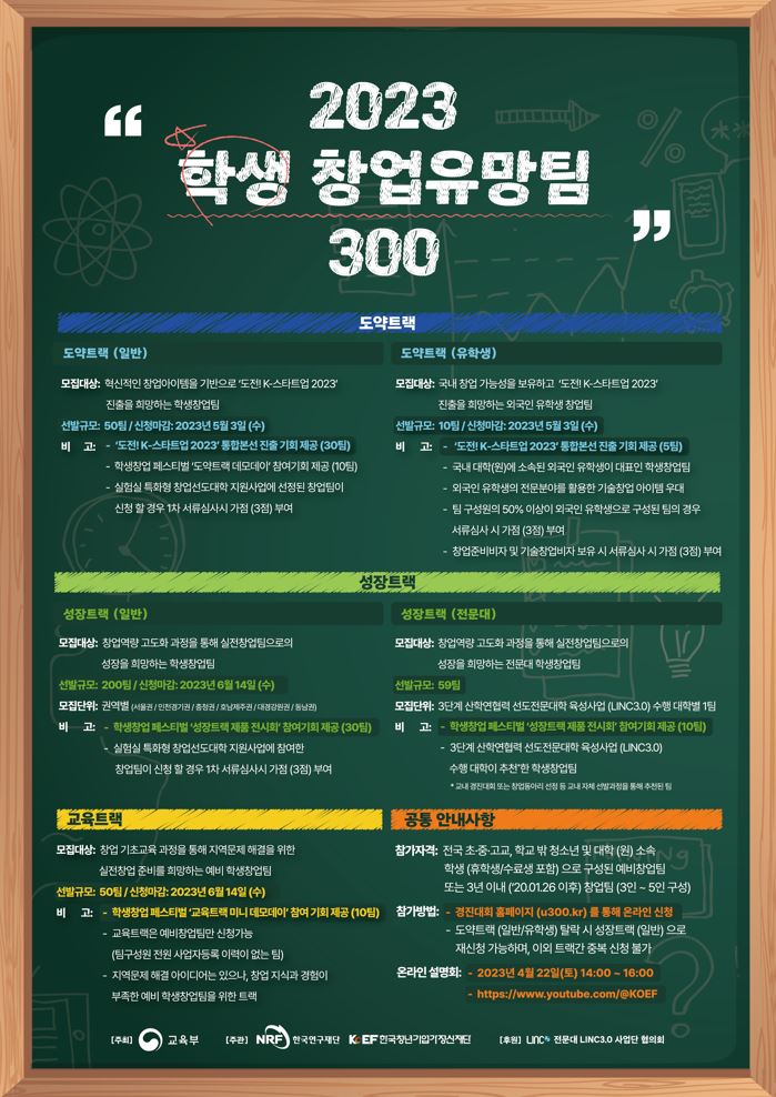 Hello to all the students who are interested in start-ups! Hosted by the Ministry of Education(교육부), and organized by the Korea Research Foundation(연구재단) and the Korea Youth Entrepreneurship Foundation(한국청년기업가정신재단), <2023 Promising Student Start-up Team 300> is Korea’s biggest student start-up competition to discover and foster promising student start-up teams. It is held to promote entrepreneurship among students with innovative ideas and skills and to spread the start-up culture. And we are looking forward to your participation.