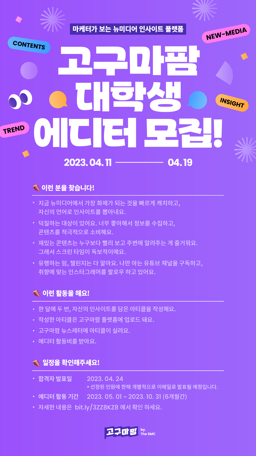 고구마팜은 마케터가 보는 뉴미디어 인사이트 플랫폼이에요. 대학생의 목소리를 마케터에게 전달하고 싶어 대학생 에디터를 모집합니다.