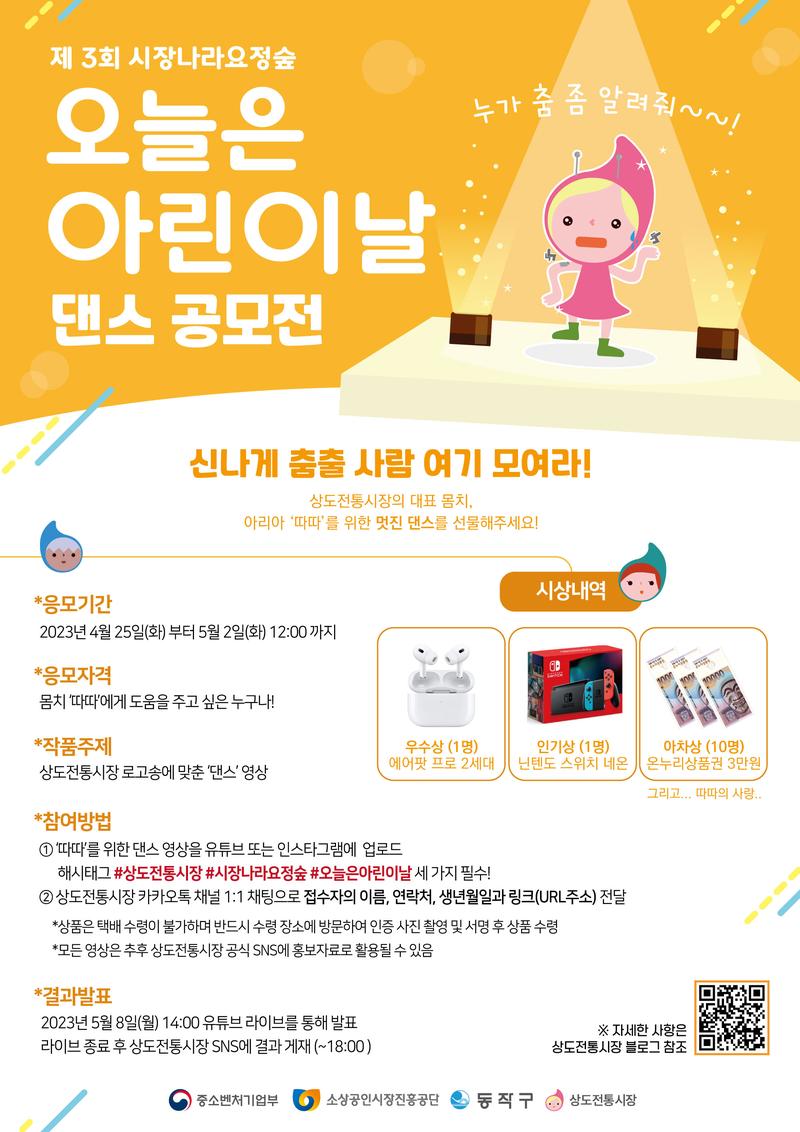 지원 방법 ① 따따를 위한 댄스 영상을 본인의 유튜브 또는 인스타그램에 업로드 하기 해시태그 필수! #상도전통시장 #시장나라요정숲 #오늘은아린이날 ② 상도전통시장 카카오톡 채널 1:1 채팅으로 접수자의 이름, 연락처, 생년월일과 링크(URL주소) 전달 ③ 응모완료! **상품은 택배 수령이 불가합니다. 반드시 직접 수령 장소에 방문하여 수령하여야 합니다. **제출해주신 영상은 추후 상도전통시장 공식 SNS에 홍보자료로 활용될 수 있습니다.