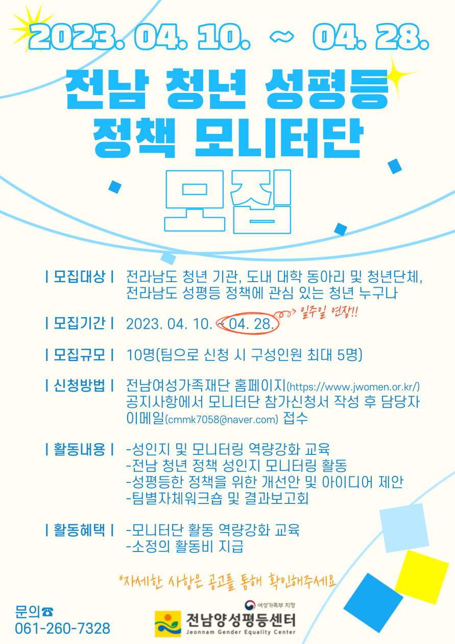 전남양성평등센터에서 청년 성평등 정책의 실효성을 높이고 성평등 인식 개선 및 문화 확산을 주도할 「전남 청년 성평등 정책 모니터단」을 모집합니다.