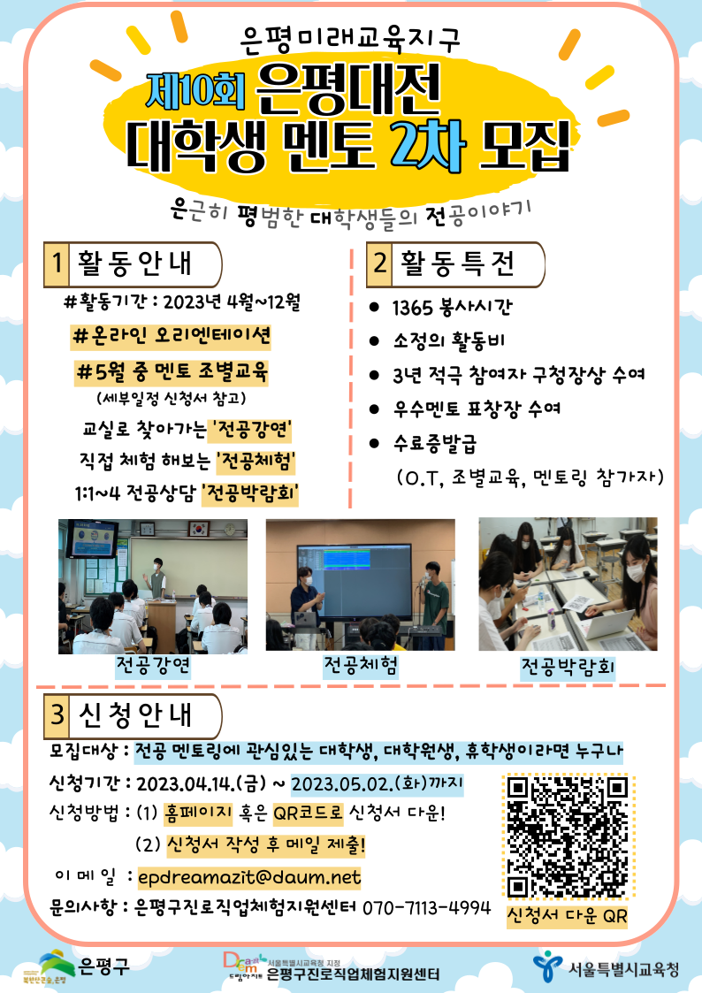 [모집요강] ※모집기간 : 2023.04.14(금) \~ 2023.05.02(화) 선착순 30명 추가 모집 ※활동내용 : - 대학생멘토교육(영상 오리엔테이션\, 조별교육) 참가 - 중·고등학교로 찾아가는 '전공강연' - 학과 실무를 체험해보는 '전공체험' - 1대 1\~4의 소그룹 전공상담 '전공박람회' ※모집대상 : - 전공멘토링에 관심있는 대학(원)생이라면 누구나 지원가능 - 은평구 중·고등학교 출신\, 거주\, 대학(원)생 우대 ※신청방법 : (1) 홈페이지(www.dreamazit.or.kr)를 통해 신청서 다운로드 (2) 신청서에 내용 기입 후 (3) epdreamazit@daum.net으로 제출