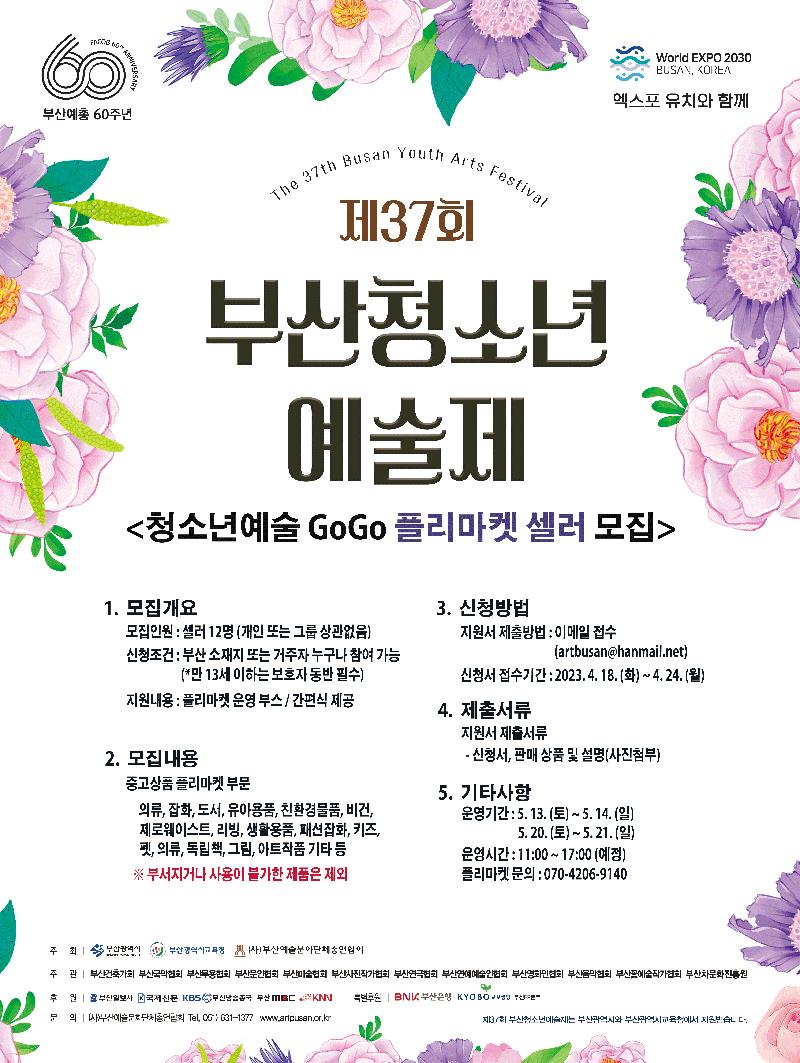 1. 모집개요 ❍ 모집인원 - 플리마켓 셀러 12명(개인 또는 그룹 상관없음) ❍ 응시자격 및 신청조건 - 부산 소재지, 부산 지역 거주자 - 누구나 참여 가능 (*만 13세 이하는 보호자 동반 필수) ❍ 지원내용 - 플리마켓 운영 부스 / 간편식 제공 2. 모집내용 ❍ 중고상품 플리마켓 부문 의류, 잡화, 도서, 유아용품, 친환경물품. 비건. 제로웨이스트, 리빙, 생활용품, 패션잡화, 키즈, 펫, 의류, 독립책, 그림, 아트작품 기타 등 ※ 부서지거나 사용이 불가한 제품은 제외 3. 신청방법 ❍ 플리마켓 운영자가 신청서 작성 ❍ 지원서 제출방법 : 이메일 접수 (artbusan@hanmail.net) ❍ 문의처 : 070-4206-9140 ❍ 신청서 접수기간 2023. 4. 17. (월) \~ 4. 23. (일) - 마감일 근무시간(18:00)까지 도착분에 한하여 유효함 4. 제출서류 ❍ 지원시 제출서류 - 신청서, 판매 상품 및 설명(사진첨부) 5. 기타사항 ❍ 운영 기간은 4/13 \~ 14일 또는 4/20 \~ 21일 토, 일요일 11:00\~17:00 예정 ※ 신청서 내 택1 또는 중복으로 선택 가능 ❍ 신청서 및 제출서류가 허위이거나 거짓일 경우 지원 대상에서 제외
