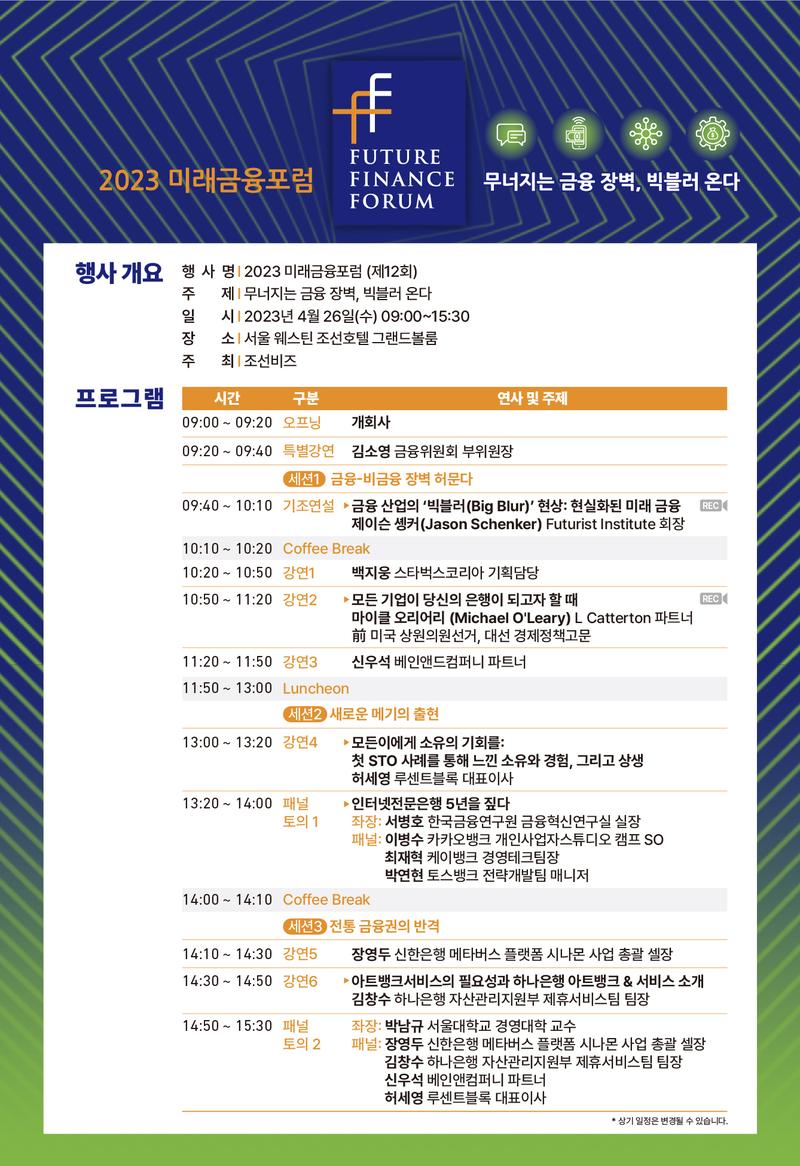 하단에 2023 미래금융포럼 행사 개요 및 프로그램 시간표 자료 공유해드리니 참고부탁드립니다. - - - - - - - - - - - - - - - - - - <2023 미래금융포럼> ▪️행사명 : 2023 미래금융포럼 ▪️주제 : 무너지는 금융장벽, 빅블러 온다 ▪️일시 : 2023년 4월 26일(수) 09:00 \~ 15:30 ▪️장소 : 서울 웨스틴 조선호텔 그랜드볼룸 ▪️주최 : 조선비즈 ▪️진행방식 : 오프라인 개최 ▪️등록비 : 대학생 : 0원(무료) 일반 : 55,000원(VAT포함) 단체등록 : 33,000원(최소 4인 이상, VAT포함) ▪️문의 이메일 \| event@chosunbiz.com 연락처 \| 02-724-6157 홈페이지 \| e.chosunbiz.com**