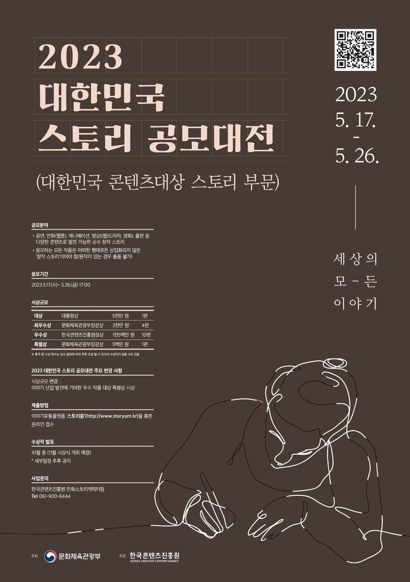 「2023 대한민국 스토리 공모대전」(대한민국 콘텐츠 대상-스토리 부문)은 공연·만화·애니메이션·영상(드라마, 영화)·출판 등 다양한 분야의 콘텐츠로 활용 가능한 원천 스토리를 발굴하는 장입니다. 수상자에게는 상금을 비롯하여 사업화를 위한 비즈니스 매칭, 사업화 콘텐츠 홍보·마케팅, 스토리 창작센터(경기도 일산 소재) 입주 신청 시 가산점 부여 등 다양한 지원을 제공합니다.‘내 스토리가 콘텐츠가 되는 꿈’을 이룰 수 있는 「2023 대한민국 스토리 공모대전」에 많은 관심과 참여 바랍니다. ● 「2023 대한민국 스토리 공모대전」 주요 변경사항 - 시상규모 변경 : 이야기 산업 발전에 기여한 우수 작품 대상 특별상(1점, 장관상) 시상 ● 공모분야 - 공연, 만화(웹툰), 애니메이션, 영상((웹)드라마, 영화), 출판 등 다양한 콘텐츠로 발전 가능한 순수 창작 스토리 - 응모하는 모든 작품은 어떠한 형태로든 상업화되지 않은 ‘창작 스토리’이어야 함(원작이 있는 경우 출품 불가) ● 시상규모 - 대상 : 대통령상 / 5천만 원 / 1편 - 최우수상 : 문화체육관광부장관상 / 3천만 원 / 4편 - 우수상 : 한국콘텐츠진흥원장상 / 1천5백만 원 / 10편 - 특별상 : 문화체육관광부장관상 / 5백만 원 / 1편 ※ 훈격 및 수상 편수는 심사 결과에 따라 추후 조정 될 수 있으며 수상자가 없을 수도 있음 ● 응모자격 - 기성 및 신인 불문(연령 제한 없음), 대한민국 국적을 보유한 개인 및 팀/법인 ※ 본 사업(대한민국 콘텐츠대상 스토리부문 포함) 2회 이상 수상 이력 보유 시 신청 불가(2회 이상 수상자가 포함된 ‘팀/법인’에도 동일 적용) ● 응모기간 - 2023 5. 17. (수) \~ 5. 26. (금) 17:00:00까지 ※ 접수 시간 외 접수분은 사유 불문 불인정(단, 진흥원의 사정일 경우 접수 연장될 수 있음) ● 제출서류 - 제출 양식 및 분량(첨부양식 다운로드, A4 기준) - 작품명 : 1쪽 - 작품개요 : 1쪽 이내 / 작품의 장르, 로그라인, 기획의도, 줄거리 - 등장인물 소개 : 2쪽 이내 - 트리트먼트 : 최대 30쪽까지 / 30p 초과 불가 - 완성화 스토리 : 최대 70쪽까지 / 희망 사업화 분야별 제출형태 준수하되 70p 초과 불가