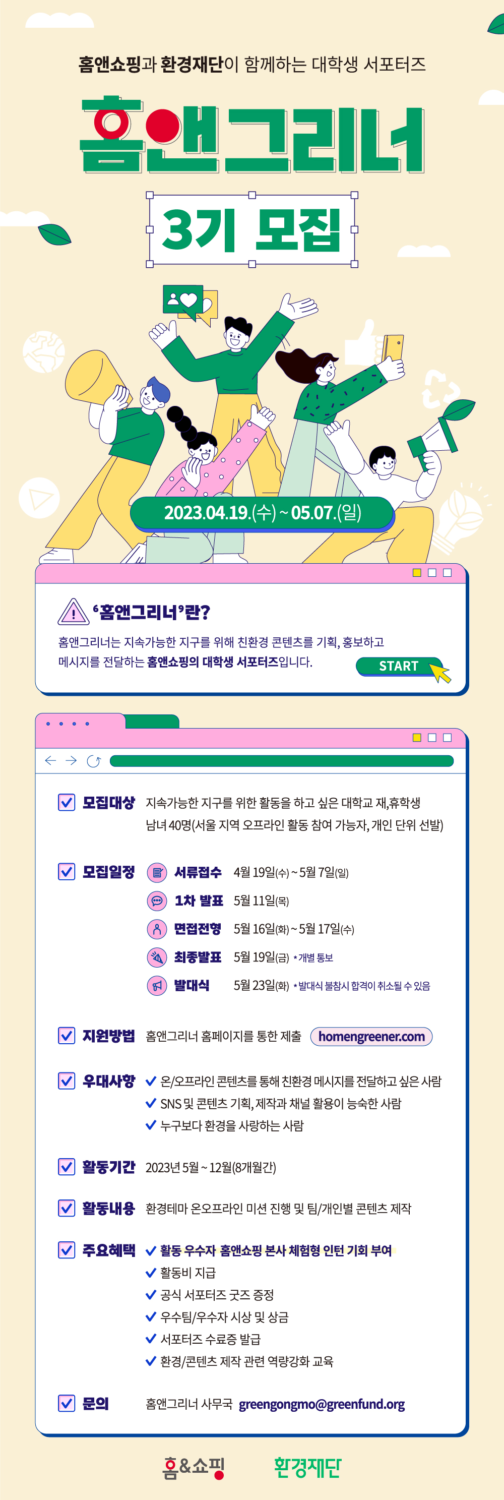 홈앤쇼핑과 환경재단이 함께하는 대학생 서포터즈 "홈앤그리너" 3기 모집 (\~5/7)🎉