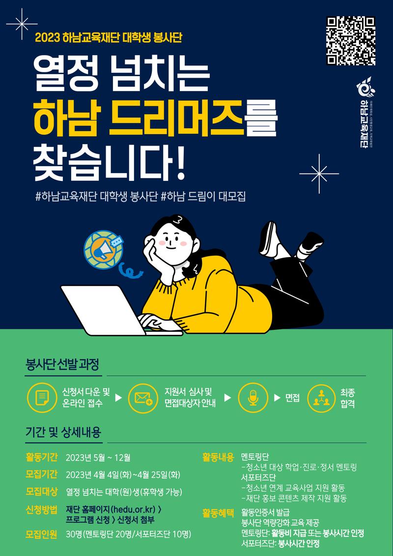 하남교육재단 대학생 봉사단 Hanam Dreamers 1기를 아래와 같이 모집합니다.