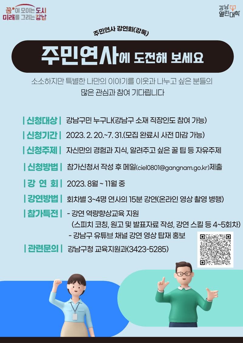 023년 강남구에서 주민이 직접 연사가 되어 강연하는 [주민연사 강연회(강톡)]에 참여할 주민연사를 모집합니다. 소소하지만 특별한 나만의 이야기를 이웃과 나누고 싶은 분들의 많은 관심과 참여 부탁드립니다. ■ 강남열린대학 주민연사 강연회(강톡) ○ 신청대상 : 강남구민 누구나(강남구 소재 직장인도 참여 가능) ○ 신청기간 : 2023. 2. 20.\~7. 31.(모집 완료 시 사전 마감 가능) ○ 신청내용 : 자신만의 경험과 지식, 알려주고 싶은 꿀 팁 등 자유주제 ○ 신청방법 : 참가신청서 작성 후 메일(ciel0801@gangnam.go.kr)로 제출 ○ 강연회 운영 : 2023. 8월 \~ 11월 중 ○ 강연방법 : 회차별 3\~4명 연사의 15분 강연(온라인 영상 촬영 병행) ○ 참가특전 - 강연 역량향상 프로그램 교육지원(스피치 코칭\, 원고 및 발표자료 작성\, 강연 스킬 등 4\~5회차) - 강남구 유튜브 채널 강연 영상 탑재 홍보 ○ 참가문의 : 강남구청 교육지원과(3423-5285)