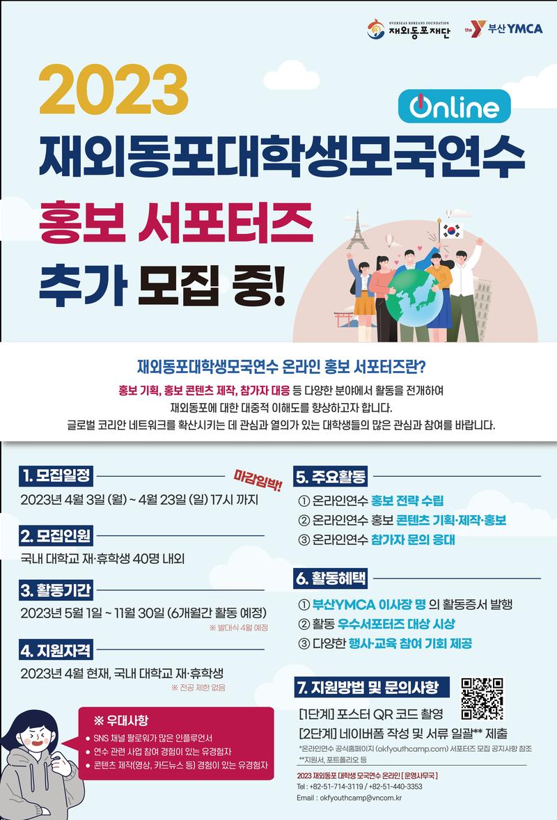 ■ 문의처 : 2023 재외동포대학생모국연수 On-line (okfyouthcamp@vncom.kr) - 운영사무국 Tel : 051-714-3119 / 051-440-3353