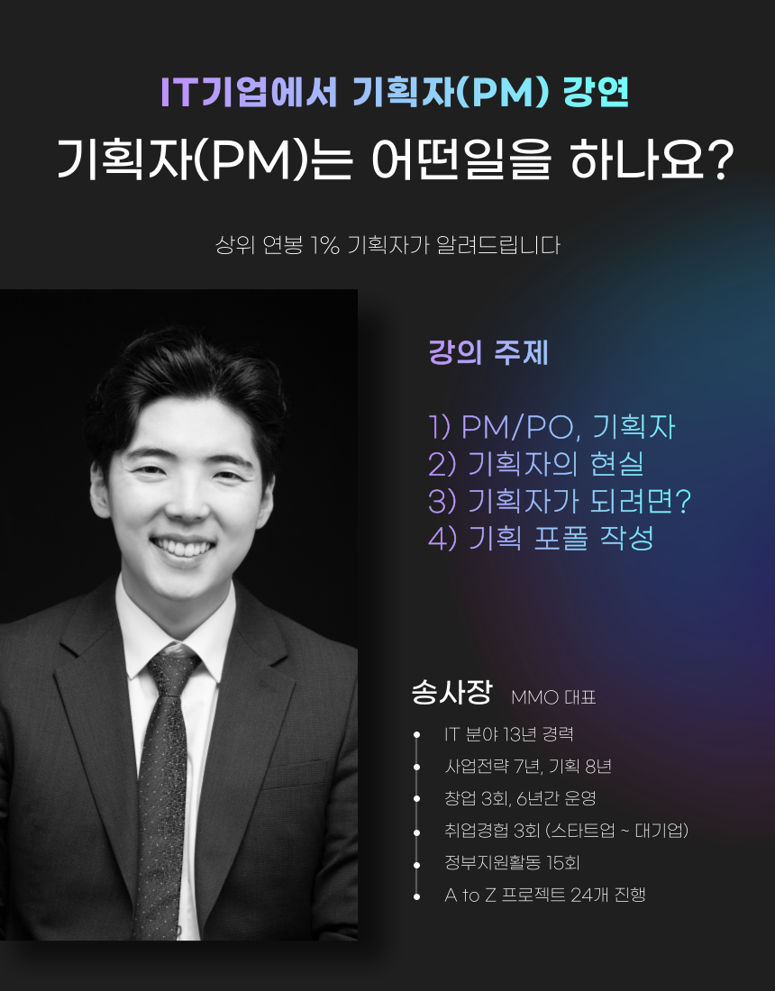 아직도 진로를 못정하셨나요? 상위 연봉 1%의 기획자가 기획직군을 소개합니다. 올해에 꼭! 좋은곳으로 취업하시기를 희망합니다. 1. 강연일시 : 04월 28일 17:00 (40분 소요 예정) 2. 강연내용 : 현업의 기획자(PM)가 여러분께 기획자(PM)를 소개합니다. 3. 신청기간 : 04월 27일 까지 신청받습니다. 4. 신청인원 : 100명 ( 선착순 ) 5. 강연진행 : 메타버스에서 진행 예정 6. 신청링크 : https://forms.gle/W3yXemv28hdscXHp8 7. 강연비 : 무료 8. 혜택 : 잇기 기획교육 수강 할인권 증정 *문의 - 이메일 : itcreator.song@gmail.com - 잇기 소개 : https://url.kr/89i7wx