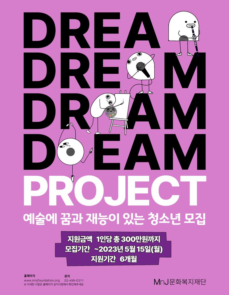 안녕하세요. MnJ문화복지재단입니다. 23년 예술영역에 꿈과 재능이 있는 드림프로젝트 9기 청소년을 모집합니다. 많은 신청과 관심을 부탁드립니다.