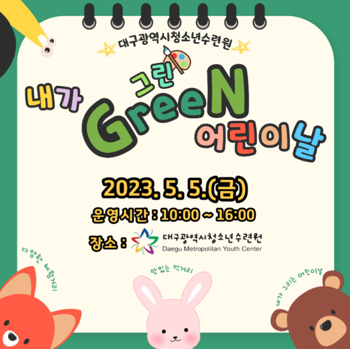 대구광역시청소년수련원’내가 Green 어린이날’ 봉사자 모집 5월 5일(금), 대구광역시청소년수련원에서 어린이날을 함께 그려 갈 봉사자를 모집합니다! ◇ 모집기간 : 2023년 4월 12일(수) \~ 4월 28일(금) 까지