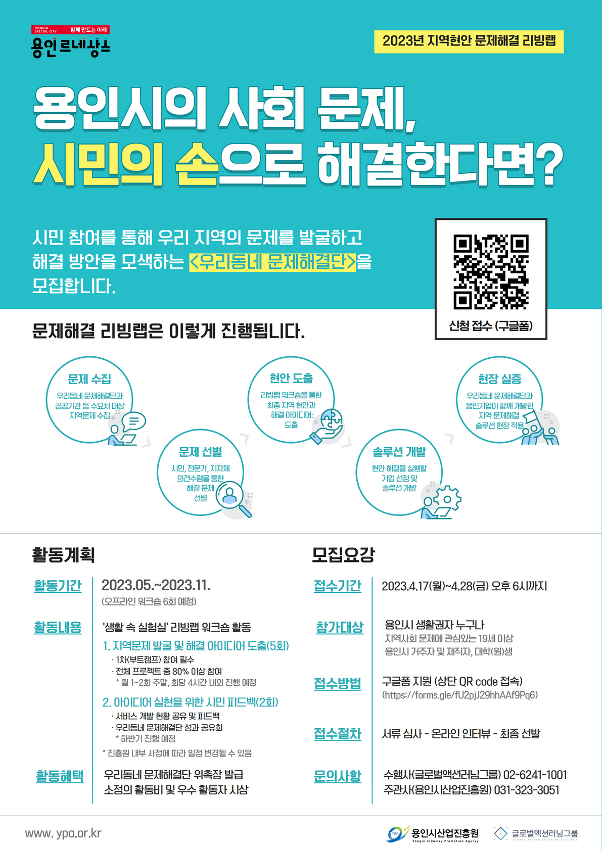용인시산업진흥원과 글로벌액션러닝그룹에서는 시민이 체감할 수 있는 지역문제를 발굴‧해결하기 위해 ‘지역현안 문제해결’ 사업을 추진하고 있습니다.