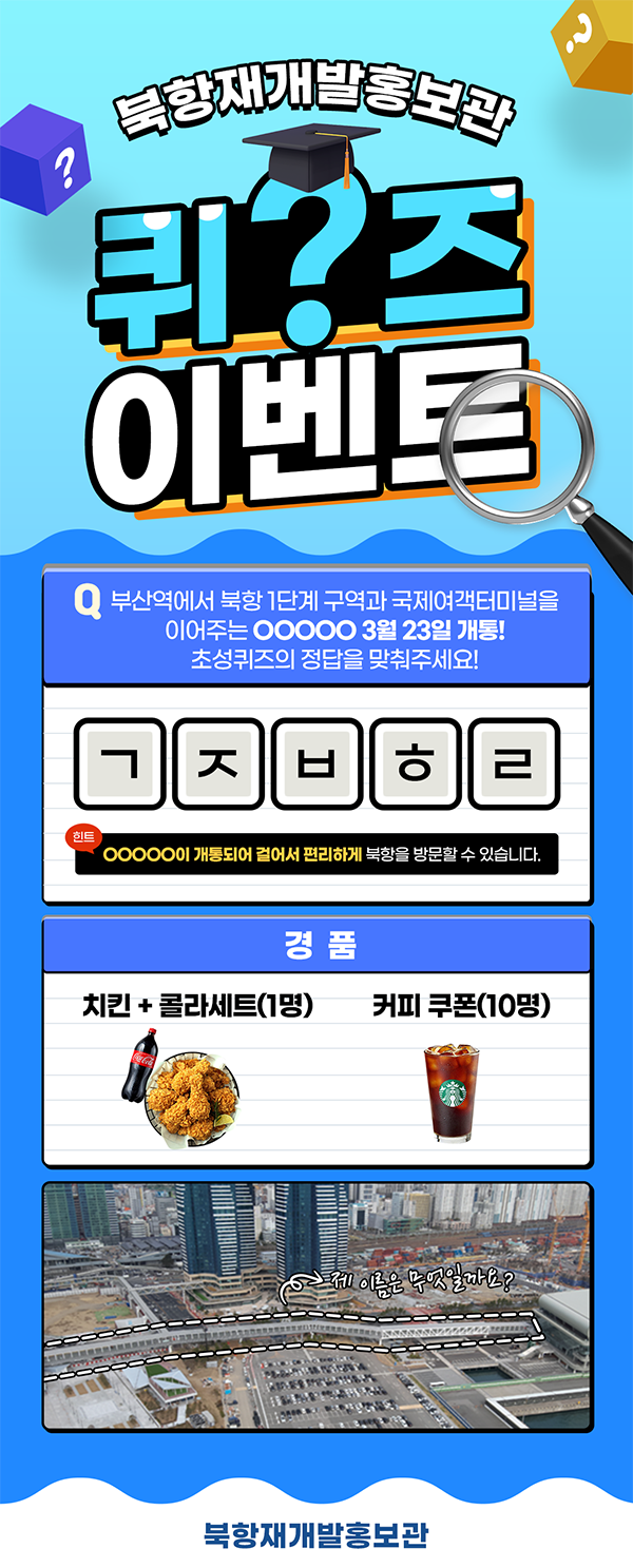 부산역(ktx) 9번 출구에서 북항을 이어주는 ㄱㅈㅂㅎㄹ가 지난 3월 23일 개통되었습니다. 덕분에 부산역에서 북항 1단계 구역까지 걸어서 편리하게 방문할 수 있는데요. 초성을 보고 정답을 맞혀주세요! 정답을 잘 모르시는 분들 커몬!! 초성퀴즈 정답 힌트 궁금하시죠?
