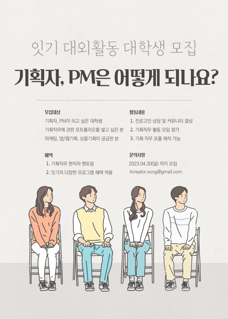 안녕하세요, 현재 IT PM/PO직 및 기획교육을 진행하고 있는 [잇기] 입니다. 잇기는 기획직무와 대학생,이직러 분들을 이어주는 역할을 하고 있습니다. '여기에 다 잇기 때문에' 현재 260분이 함께 기획직무에 대한 활동을 하고 계십니다. 저희 잇기는 기획직무에 관심있는 분들에게 도움을 드리고 싶습니다. 잇기와 함께한 포폴 결과 : https://itcreatoredu.notion.site/6f91362cf6494d3088e05c94489083bc 기획직무에 많은 관심을 갖고 함께 하기를 희망합니다. **활동 종류 1. 리서칭 모임 : 매주 목요일 주제별로 시장조사 자료를 공유하는 활동을 합니다. 2. 마케터직무방 : 실무 마케터분들과 대학생분들의 소통공간입니다. 3. 잇기 현직자방 : 현직에 계신 기획자분들만의 소통공간입니다. **모집기간 : 04월 30일까지 **참가비 : 무료 **혜택 1. 잇기에서 진행하는 모든 프로그램 할인가 제공 2. 포폴 및 모의면접 이용 가능 3. 기획직무에 대한 인프라 제공 **신청링크 : https://forms.gle/UHkfp4nbfzBxeTT6A **문의 1. 잇기 소개 : https://url.kr/89i7wx 2. 카톡 : https://open.kakao.com/o/sUyKZ3te