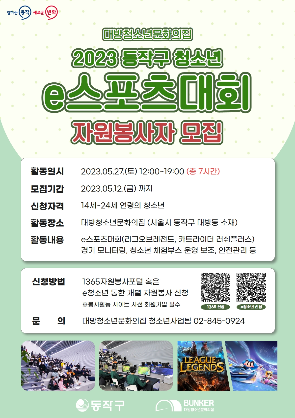 * 활동일시: 2023.05.27.(토) 12:00\~19:00 (총 7시간) * 모집기간: 2023.04.20.(목)\~05.12.(금) * 신청자격: 14세\~24세 청소년 * 활동장소: 대방청소년문화의집(서울시 동작구) * 봉사내용: e스포츠대회(리그오브레전드, 카트라이더 러쉬플러스) 경기 모니터링, 청소년 체험부스 운영 보조, 안전관리 등 * 신청방법: QR코드 또는 하단 링크 참조 * 문의: 대방청소년문화의집 청소년사업팀 02-845-0924
