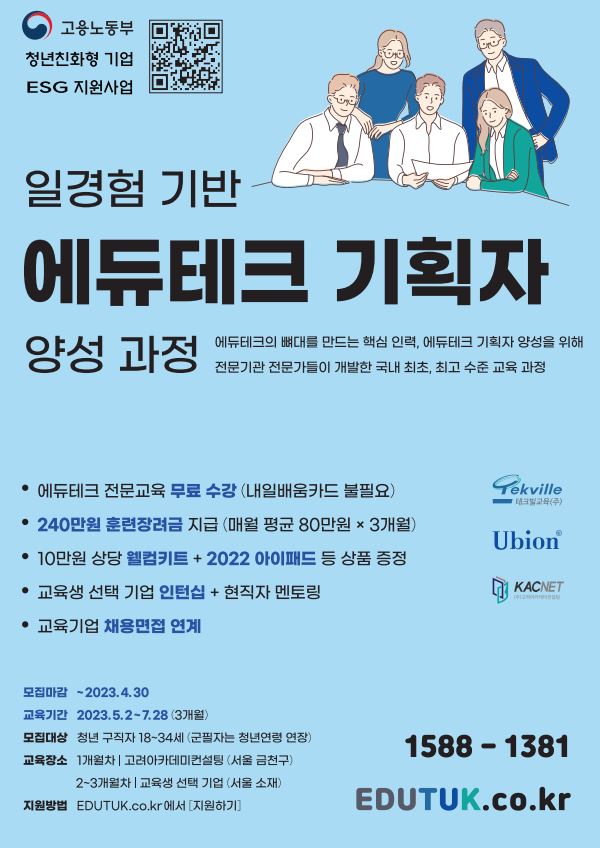 고용노동부 청년친화형 기업 ESG지원사업 [에듀테크 기획자 양성과정] 미래 인재인 청년들의 직무역량을 향상시켜, 에듀테크 관련 취업 기회 제공과 관련 산업을 활성화하며 사회적 가치를 창출하는 기업 지원 프로그램입니다.