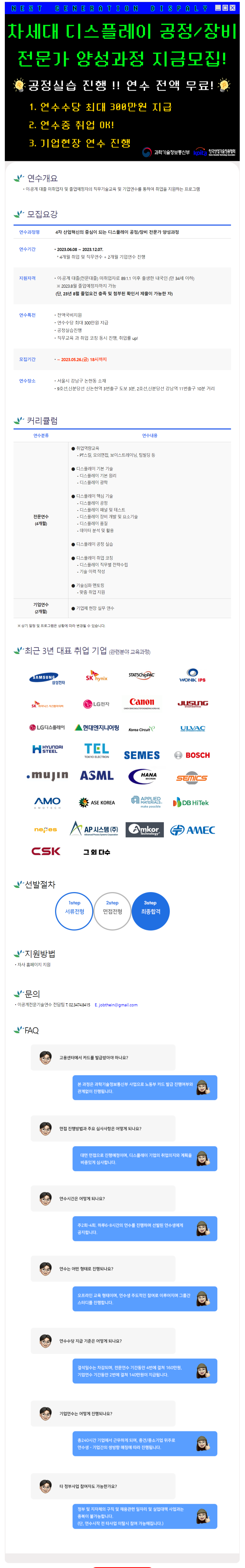 ● 연수 기간 : 2023.06.08\~2023.12.07 (4개월 직무연수 + 2개월 기업연수 진행) ● 활동 내용 -취업역량교육(PT스킬, 모의면접, 보이스트레이닝, 팀빌딩 등) -디스플레이 기본 기술(디스플레이 기본 원리, 디스플레이 광학) -디스플레이 핵심 기술(디스플레이 공정, 패널 및 테스트, 장비 개발 및 요소기술, 품질, 데이터 분석 및 활용) -디스플레이 공정 실습 -디스플레이 취업 코칭(디스플레이 직무별 전략수립, 기술 이력 작성) -기술심화 멘토링(맞춤 취업 지원) ●지원자격 -이·공계 대졸(전문대졸) 미취업자로 89.1.1 이후 출생한 내국인 (만 34세 이하) ※ 23년 08월 졸업예정자까지 가능 (단, 23년 8월 졸업요건 충족 및 지원서의 첨부된 확인서 제출이 가능한 자) ● 연수 특전 -전액국비지원 -연수수당 최대 300만원 지급 -공정실습 진행 -직무교육과 취업 코칭 동시 진행, 취업률 UP!! ● 지원 방법 https://edu.thein.kr/thein/member/courseDetail?degreeIdx=98