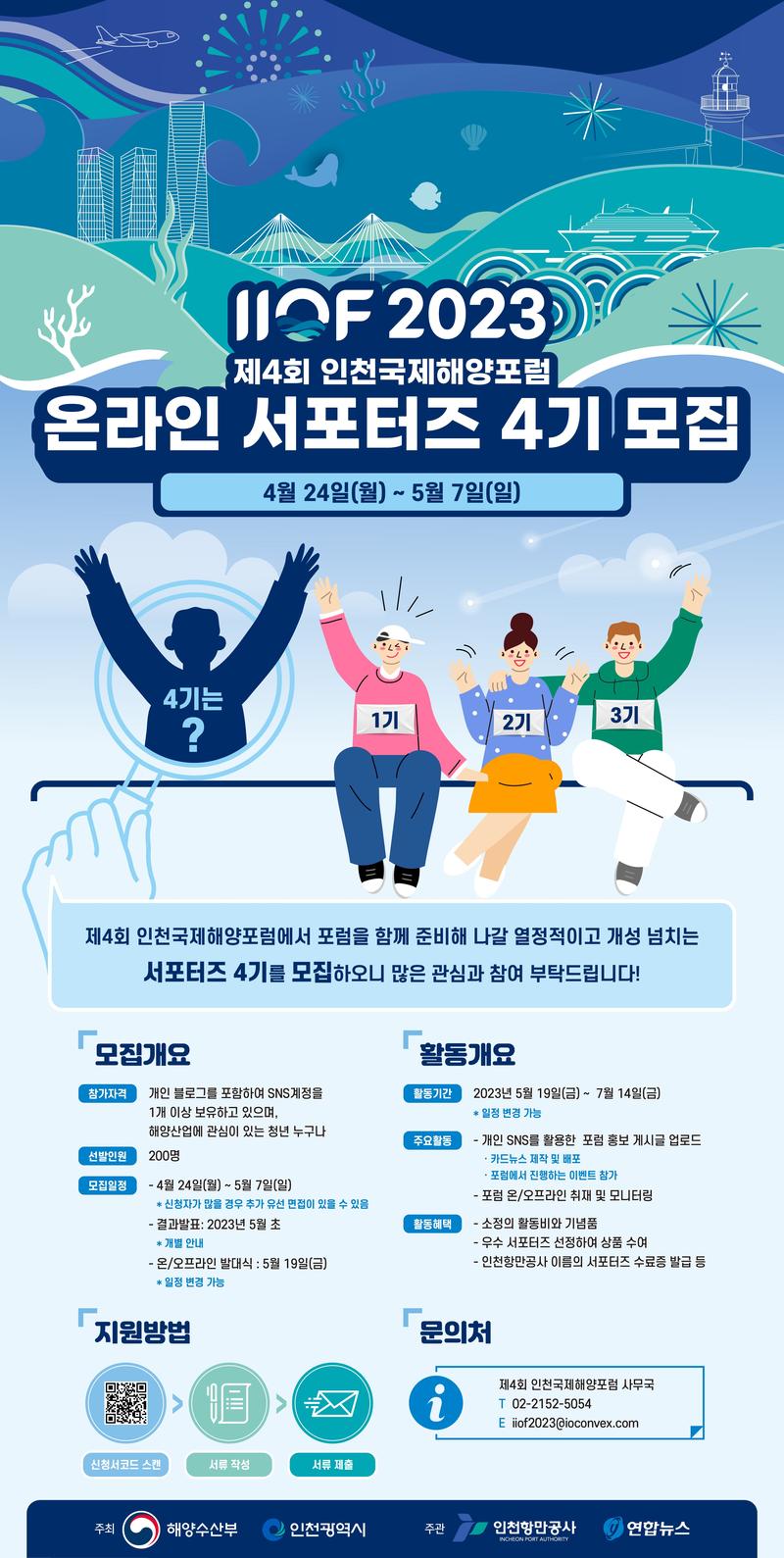 --활동개요-- ▶ 주요활동 1.본인의 SNS 기술을 활용한 홍보할동 2.카드뉴스 제작 및 배포 3.즐거운 행사 모니터링 및 취재 ▶ 활동기간 2023년 5월 19일(금) \~ 7월 14일(금) *일정 변경 가능 ▶ 활동혜택 1. [소정의 활동비]와 [서포터즈 기념품] 지급! 2. 인천항만공사 이름의 [서포터즈 수료증] 발급! 3. 우수 서포터즈에겐 [바다의 선물]이 ! ❗❗미래가 열릴 해양에서 함께할 열정 있는 서포터즈 분들의 응답을 기다립니다❗❗ 많은 관심과 적극적인 참여 부탁드립니다! *기타문의 제4회 인천국제해양포럼 사무국 Tel. 02-2152-5054 / Email. iiof2023@ioconvex.com
