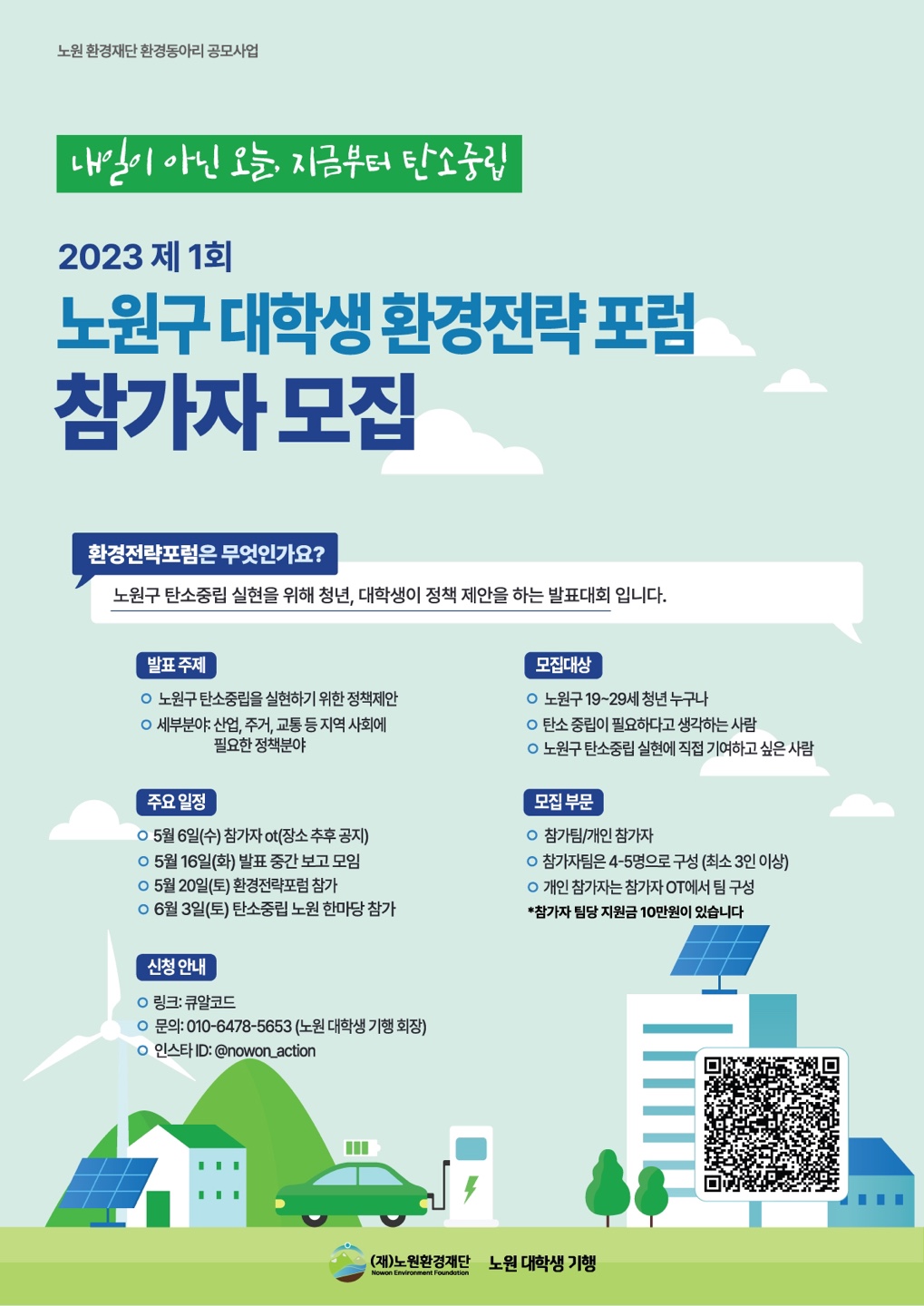 🍀주요 활동 -5월 6일(토) 참가자 OT(장소 추후 공지) -5월 16일(화) 발표 중간 보고 모임 -5월 20일(토) 환경전략포럼 참가 -6월 3일(토) 탄소중립 노원 한마당 참가 *참가자 OT는 필수 참가입니다.