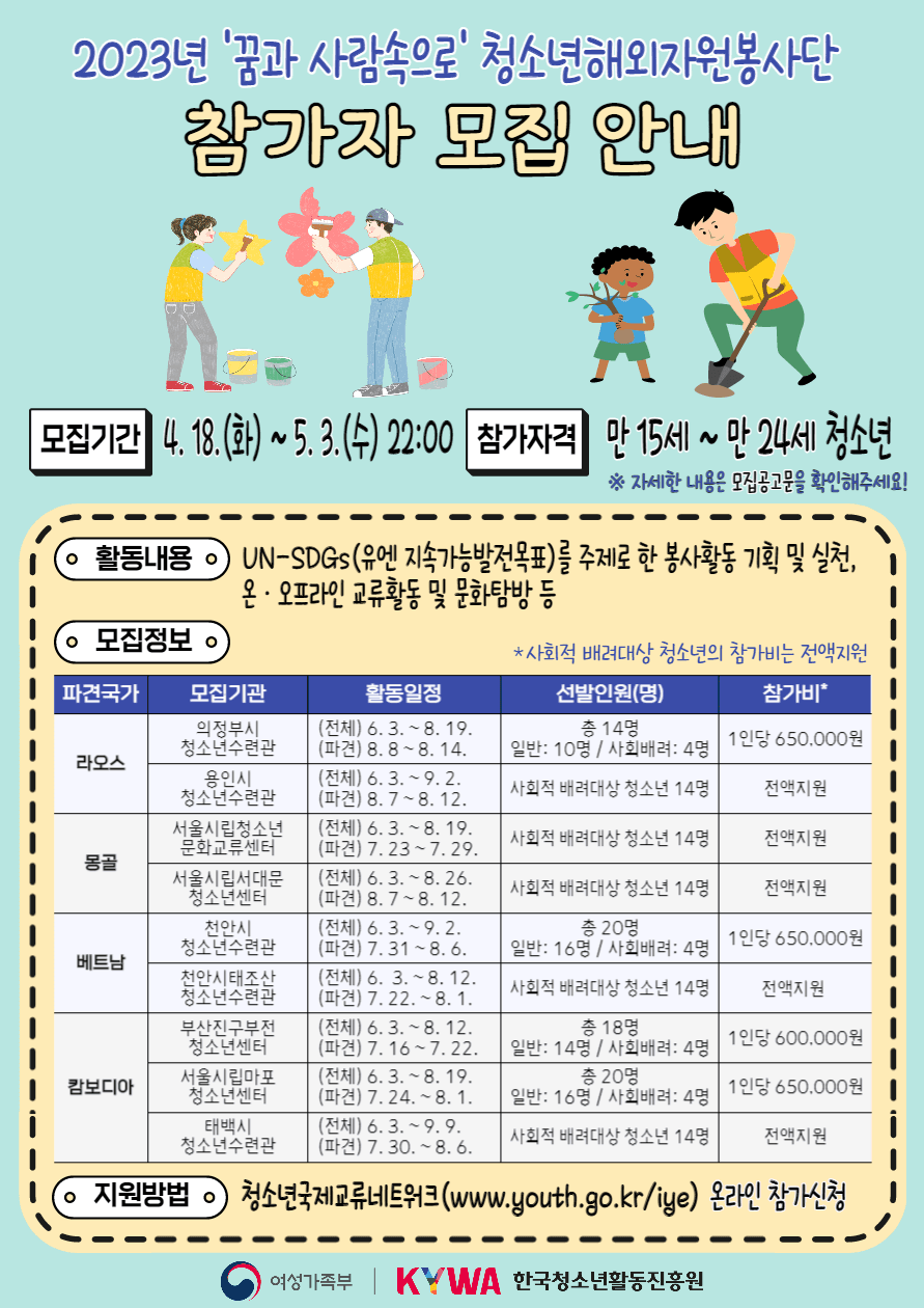 ● 모집 개요 청소년의 사회참여 의식 및 국제적 역량을 강화하기 위해 여성가족부가 주최하고 한국청소년활동진흥원이 주관하는 '꿈과 사람속으로' 청소년해외자원봉사단 사업에 참여할 청소년을 모집합니다. 해외봉사활동에 관심 있는 청소년 여러분의 많은 참여 바랍니다.