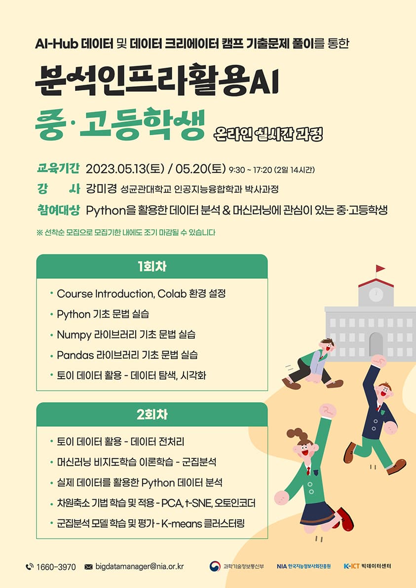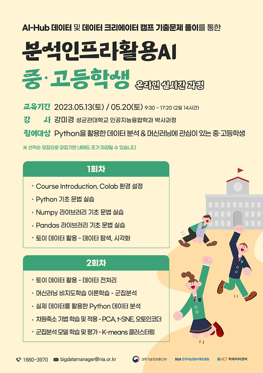 분석인프라활용AI 중·고등학생 온라인 실시간 과정 교육생 모집! 신청방법 1) K-ICT 빅데이터센터 홈페이지( https://kbig.kr/ ) 회원가입 2) 교육 및 세미나에서 해당 과정 클릭 3) 교육신청 클릭 - 개인정보활용 동의 회신