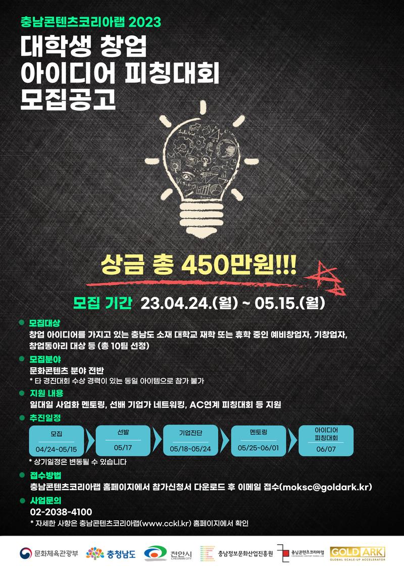 (재)충남정보문화산업진흥원에서 충청남도 내 대학생들을 대상으로 아이디어 발굴 및 사업화 연계를 지원하는 대학생 창업 아이디어 피칭대회를 아래와 같이 공고합니다. ※캐릭터, 웹툰, 게임, 애니메이션, 음악, 실감콘텐츠(AR/VR, 홀로그램 등) 등 콘텐츠 상품의 기획, 개발, 제작, 생산, 유통, 서비스 등과 관련된 콘텐츠 분야 ※콘텐츠 장르 간, 순수예술과 첨단기술 간, 콘텐츠와 기술 간 융합에 기반한 새로운 창작과 비즈니스 사업화 분야 ▶모집개요 사업목적 : 충남도 내 대학생 사업 아이디어 발굴 및 사업화 연계 접수기간 : 2023년 4월 24일(월) \~ 5월 15일(월) 신청자격 : 창업 아이디어를 가지고 있는 충남도 소재 대학교 재학 또는 휴학 예비창업자, 기청업자, 창업동아리 등 모집규모 : 총 10팀 ▶지원내용 및 혜택 지원내용 : 역량진단, 분야별 멘토링, 선배 기업가 강연 및 네트워킹, 아이디어 피칭대회 지원혜택 : 우수팀 대상 상금 지급 ▶지원방법 충남콘텐츠코리아랩 홈페이지 (www.cckl.kr) 에서 참가신청서 다운로드 후 이메일 접수(moksc@goldark.kr) ▶사업문의** 문의 : (주)골드아크 연락처 : 02-2038-4100
