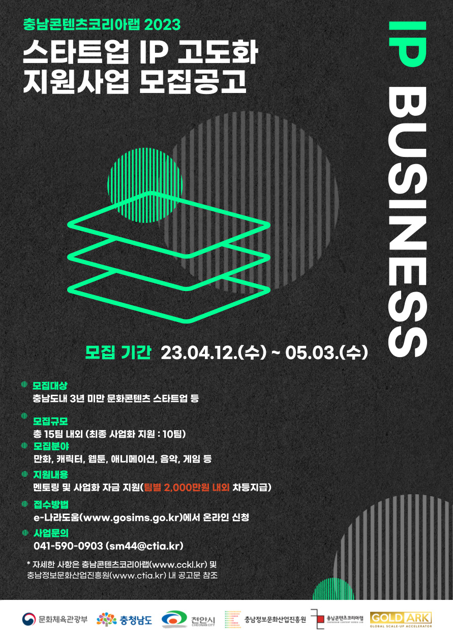 2023 충남콘텐츠코리아랩 스타트업 IP 고도화 지원사업 모집공고 (재)충남정보문화산업진흥원에서 콘텐츠 IP 비즈니스의 체계적 고도화를 희망하는 충남도 내 문화콘텐츠 스타트업 대상 스타트업 IP 고도화 지원사업을 아래와 같이 공고합니다. ※캐릭터, 웹툰, 게임, 애니메이션, 음악, 실감콘텐츠(AR/VR, 홀로그램 등) 등 콘텐츠 상품의 기획, 개발, 제작, 생산, 유통, 서비스 등과 관련된 콘텐츠 분야 ※콘텐츠 장르 간, 순수예술과 첨단기술 간, 콘텐츠와 기술 간 융합에 기반한 새로운 창작과 비즈니스 사업화 분야 ▶모집개요 사업목적 : IP 비즈니스 진단 및 밀착 멘토링을 통한 비즈니스 도약 도모 접수기간 : 2023년 4월 12일(수) \~ 5월 3일(수) 16시까지 신청자격 : 충남도내 3년 미만 문화콘텐츠 스타트업 ※ 예비창업자 지원 불가 모집규모 : 총 15팀 내외(최종 사업화 지원 10팀 선정) ▶지원내용 및 혜택 지원내용 : 역량진단, 멘토링, 교육, 네트워킹 지원혜택 : 최종 선정 10팀 대상 사업화 지원금 지급(팀당 2,000만원 내외 차등지급) ▶지원방법 e나라도움 홈페이지 (https://www.gosims.go.kr) > '충남콘텐츠코리아랩' 검색 > '공모사업' 탭 선택 > '스타트업 IP 고도화 지원사업' 선택 > 우측 상단 '공모신청 바로가기' 선택 ▶사업문의 문의 : 충남콘텐츠코리아랩 연락처 : 041-590-0903
