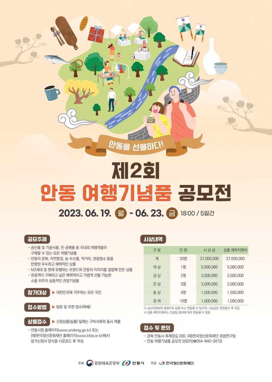 응모주제 - 공산품 및 가공식품\, 민·공예품 등 국내외 여행객들이 구매할 수 있는 모든 여행기념품 - 안동의 문화\, 자연환경\, 농·수산물\, 먹거리\, 관광명소 등을 반영한 우수하고 매력적인 상품 - MZ세대 및 현재 유행하는 트렌드와 안동의 이미지를 결합해 만든 상품 - 관광객이 구매하고 싶은 매력적이고 가볍게 선물 가능한 소품 위주의 실용적인 관광기념품 참가대상 - 대한민국에 거주하는 모든 국민 접수방법 - 접수방법 : 방문 및 우편접수 (기한 내 도착분에 한함) ※ 우편접수 시 반드시 우편제출 확약서를 동봉하여 발송 - 접수처 : (재)한국정신문화재단 관광연구팀 - 주소 : (36709) 경북 안동시 축제장길200 (재)한국정신문화재단 관광연구팀 안동 여행기념품 공모전 담당자 앞(☎054-840-3473) 응모제한 - 상품화 가능성이 없고 대량생산 및 판매가 불가능한 상품 - 특허권\, 상품권\, 저작권\, 디자인권 등 국내외 관련 법규에 따른 법정 분쟁의 소지가 있는 상품 - 국내외에 이미 상품화\, 유통\, 판매 중인 작품의 유사 상품 - 타 공모전에 접수하여 입상한 제품과 입상 상품을 모방하였을 경우 - 작품\, 작품설명서\, 가격표 및 포장 등이 세트로 구성되지 않은 상품 - 수상 후 제작을 고려하지 않은 아이디어 상품 - 상품화 제작 지원에 참여할 의도가 없으면 수상을 취소할 수 있음 - 과도한 고가상품이거나 보관·운반이 곤란하여 관광기념품으로의 상품화가 어려운 상품 - 상품 제작 기간이 1개월 이하 소요되는 상품 - 안동시에서 주최한 ‘2022 안동여행기념품 공모전’에서 수상한 상품 - 최종 원산지가 대한민국이 아닌 상품 응모일정 - 공모기간 : 2023. 4. 24. (월) \~ 2023. 6. 23. (금) ※ 접수기간 : 2023. 6. 19. (월) \~ 6. 23. (금), 18:00 / 5일간 - 심사기간 : 2023. 7월 중 작품규격 - 개별 상품 크기 : 가로 30cm × 세로 30cm × 높이 30cm 이내 - 개별 상품들을 합한 전체(세트) 작품 크기 : 가로 60cm × 세로 60cm 이내 ※ 말거나 접이 형태의 최종 포장 상태의 크기 기준 - 신청서 작성 시 소비자희망가격(부가세 포함) 5만원 이내로 기재 - 개인(업체)당 최대 2건까지 접수 가능. 단\, 접수하는 상품의 신청서는 개별 작성해야 함 - 세트 상품의 경우\, 1건당 최대 3개 상품까지 접수 가능. 단\, 패키징은 하나의 세트로 구성되어야 함. 수상 이후 개별 판매 불가 - 2개 이상의 신청작 중 하나 이상의 상품이 수상 시 상위 순위의 한 상품만 수상작으로 선정 - 상품접수 시 상품 이외의 판넬\, 장식 소품\, 마네킹 등은 일절 접수받지 않음 - 보조금 지원으로 제작된 상품은 지원 불가(일부 지원이라도 해당) 접수 시 유의사항 - 접수 마감 시간 이후에는 제출 불가 - 상품 제작·패키징 등 최종 포장 이후 상자에 담아서 접수해야 함 - 우편 및 택배 접수 시 파손·변형·변질·분실 등에 대한 책임은 신청자 본인에게 있음 - 파손 우려가 있는 상품은 안전장치를 해야 함 - 식품의 경우\, 시식용 상품을 별도 추가 제출해야 함(2차 심사에 한함) ※ 상품접수 시\, 제출일 안내 예정 - 신청작이나 신청작 주변에 신청자에 관한 사항을 표시할 수 없음 ※ 성명\, 업체명\, 상품명\, 상품설명 등 - 신청작이 2인 이상의 공동상품일 경우\, 공동명의 상장 1개만 수여됨 ※ 시상금의 경우\, 대표자 1인에게 지급 - 수상작은 공익 목적의 작품집 및 기타 광고\, 홍보 등에 활용·배포될 수 있음 - 접수된 이후 상품의 지식재산권은 법적으로 보호받을 수 없으며\, 이를 보호받기 위해서는 신청자가 접수 이전에 직접 지식재산권을 획득해야 함 - 수상작에 대한 지식재산권은 주최기관과 저작자 공동소유를 원칙으로 하며\, 우선협상권은 주최기관에 있음 - 수상 후 상품 제작 지원에 참여할 의도가 없으면 수상을 취소할 수 있음 - 신청서 내용이 사실과 다르거나 허위 작성으로 판명되는 경우\, 심사에서 제외됨 ※ 접수한 서류에 대한 모든 책임은 접수자에게 있음 - 기타 정하지 않은 사항 발생 시 주최 측의 결정에 따름 ※ 기존의 상품 또는 타인의 아이디어를 모방한 내용을 접수하였을 경우, 생기는 모든 피해에 대한 책임은 접수자 본인에게 있음 ※ 제출한 상품 실물(수상작)은 향후 전시 및 홍보를 위해 반환하지 않고 주최 측에 귀속됨 시상내역 대상(1) 상금 500만원 / 상품 제작지원비 500만원 금상(2) 상금 350만원 / 상품 제작지원비 350만원 은상(3) 상금 300만원 / 상품 제작지원비 300만원 동상(4) 상금 150만원 / 상품 제작지원비 150만원 장려상(10) 상금 100만원 / 상품 제작지원비 100만원 유의사항 - 본인 직접접수 및 반출 원칙\, 타인이 대리접수 및 반출 시 신청자의 신분증 및 자필 위임장 제출 필요 - 접수기간 내 구비서류 미비 시 서류접수 불가 - 서류는 컴퓨터로 작성하여 인쇄 후 자필 서명 또는 도장 날인을 원칙으로 함 - 상품에 신청자 정보 및 상호 등이 포함되거나 유추할 수 있는 경우\, 표기 내용을 ‘OOO’의 형태로 변경하거나 스티커 등으로 가린 후 제출(위반 시 감점 처리될 수 있음) - 우편접수 시 파손에 대한 책임은 신청자 본인에게 있음 문의 - 안동 여행기념품 공모전 담당자 - 054-840-3473