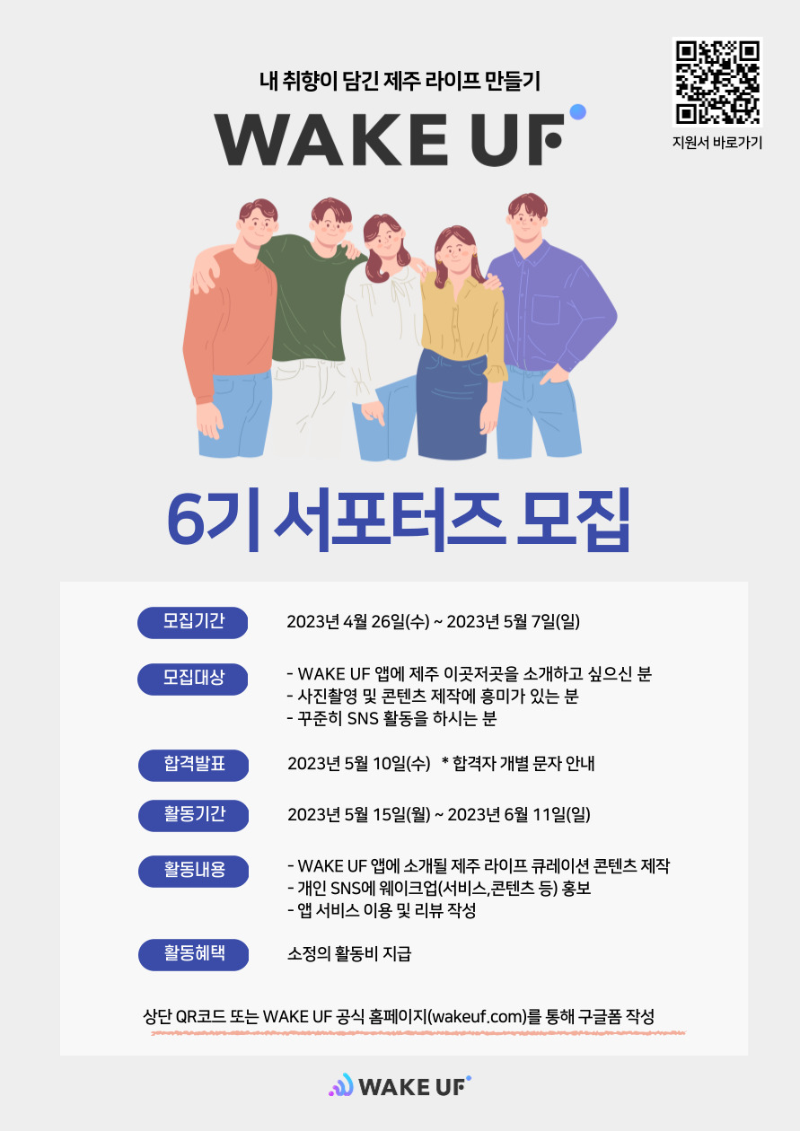 웨이크업 6기 서포터즈 모집 ○ 모집개요 - 내가 만드는 WAKE UF! 내 취향이 담긴 제주 라이프 큐레이션 콘텐츠를 웨이크업 앱에 소개 해보세요. ○ 기간 및 일정 - 모집 기간 : 2023.04.26(수) \~ 2023.05.07(일) - 합격자발표 : 2023.05.10(수) * 합격자 개별 문자 안내 - 활동기간 : 2023.05.15일(월) \~ 2023.06.11(일) ○ 지원자격 - WAKE UF 앱에 제주 이곳저곳을 소개하고 싶으신 분 - 사진촬영 및 콘텐츠 제작에 흥미가 있으신 분 - 꾸준히 SNS활동을 하시는 분 ○ 활동내용 - WAKE UF 앱에 소개될 "제주 라이프스타일" 큐레이션 콘텐츠 제작 - 개인 SNS에 웨이크업 홍보활동 - 앱 서비스 이용 및 리뷰 작성