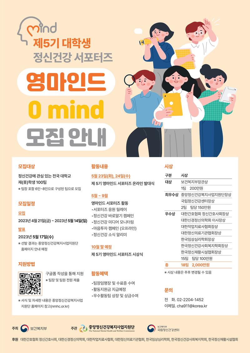 -------------------------------------------------------------------------------------------- * **영마인드 서포터즈 접수는 5월 14일 오후 11시 59분 59초까지 부탁드립니다. -------------------------------------------------------------------------------------------- 안녕하세요. 중앙정신건강복지사업지원단입니다. 중앙정신건강복지사업지원단에서는 청년층의 정신건강 인식개선 활동을 위해 대학생 정신건강 영마인드 서포터즈 제5기를 아래와 같이 모집합니다. 참여자 요청으로 인해 모집기간을 5월 14일(일) 23시 59분 까지 연장 하오니 관심있는 분들의 많은 참여 바랍니다.