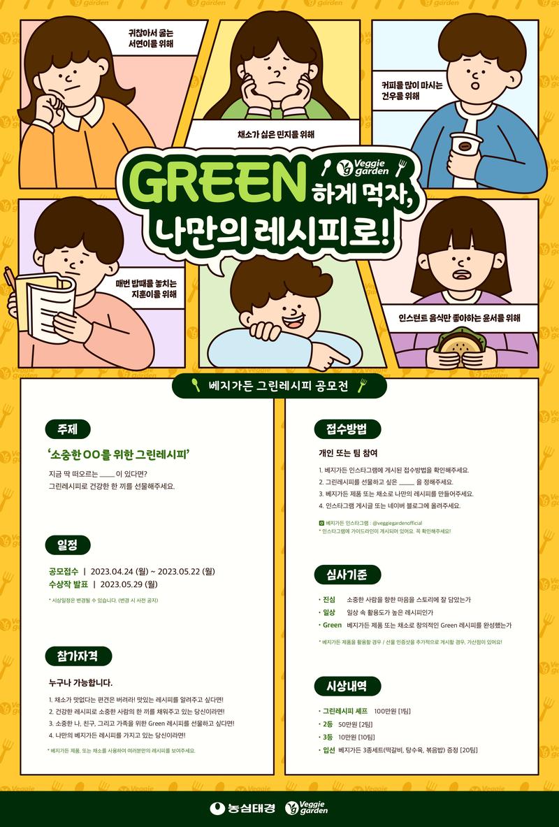 💚그린레시피 공모전💚 귀찮아서 굶거나, 자극적인 것만 찾던 __에게! 오늘은 또 뭐 먹지 하며 냉장고도 열어보지만, 결국 ‘대충 때우지 뭐’라고 말하는 게 일상인 __에게! 나에게 소중한 __에게! 🌿 Green 하게 먹자! 🌿 나만의 레시피로! 소중한 나, 친구, 가족, 댕댕이, 냥이가 조금 더 건강하게 먹었으면 하는 마음, 한 끼를 선물하고 싶은 마음을 나만의 레시피로 표현해주세요! 🌳 주제 : ‘소중한 OO를 위한 그린레시피’ 🌳 공모접수 : 2023.04.24.(월) \~ 2023.05.22.(월) 🏆 시상내역 🏆 - 그린레시피 셰프 : 100만원 (1팀) - 2등 : 50만원 (2팀) - 3등 : 10만원 (10팀) - 입선 : 베지가든 3종세트 증정 (20팀) ** 자세한 사항은 베지가든 인스타그램을 참고해주세요! https://www.instagram.com/p/CrZ76CRLS67/?igshid=YmMyMTA2M2Y=