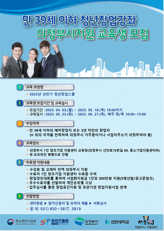 ■ 모집대상 : 의정부시 관내 만 39세 이하의 예비창업자 및 창업 3년 미만의 기창업자