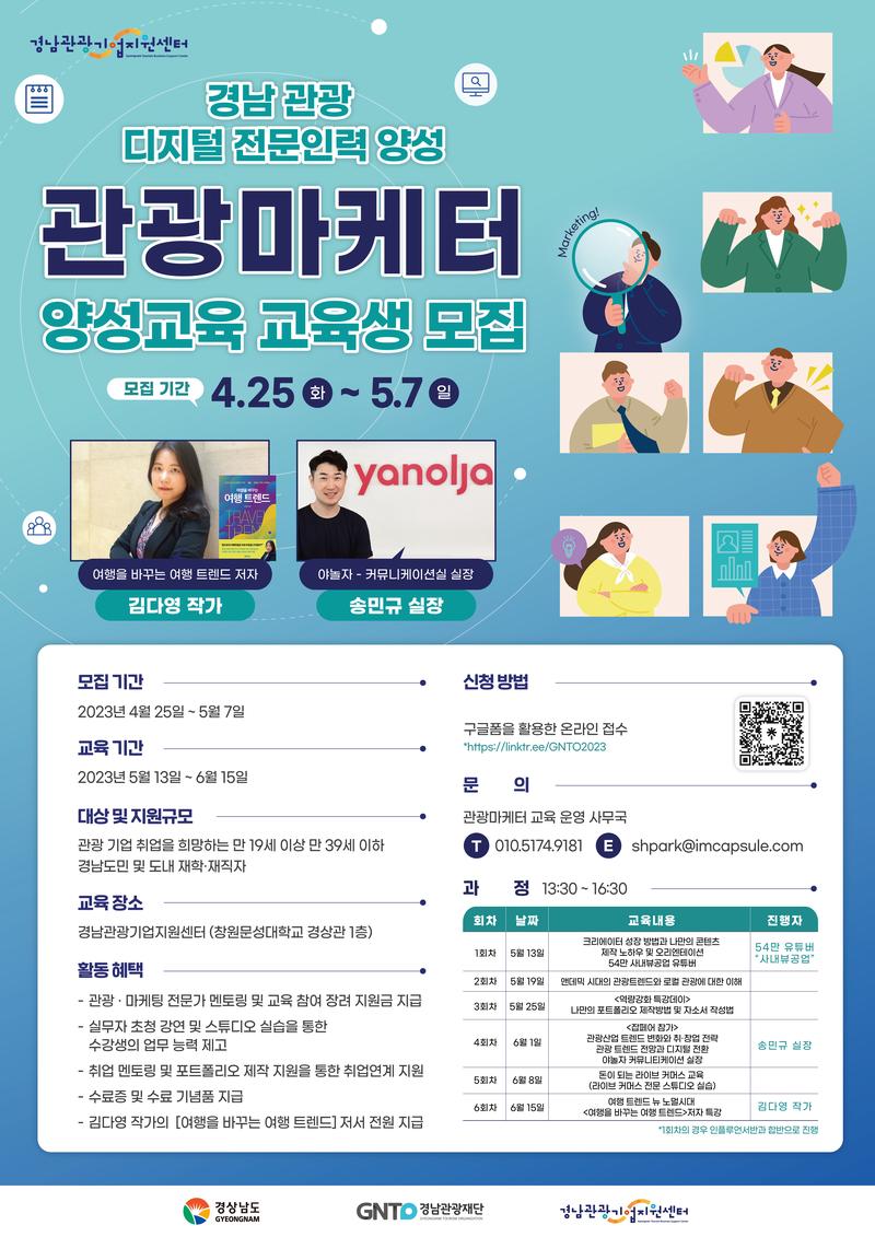 <경남 관광 디지털 전문인력 양성교육 관광마케터 수강생 모집> ○ 모집개요 - 경남 지역 관광콘텐츠 활용 전문가 육성을 위한「경남 관광 디지털 전문인력 양성교육」참가자를 모집합니다. 경남 관광 콘텐츠 기획·제작, 1인 미디어, 마케팅 또는 관광 분야 취업에 관심이 있는 분들의 많은 참여 바랍니다. ○ 기간 및 일정 - 모집기간: 2023.4.25.(화)\~5.7(일) - 수업일정: 2023.5.13.(토)\~6.15(목) (반별 일정 상이) * 관광마케터반: 2023.5.13\~6.15, 매주 목요일 오후 1:30\~4:30(3시간), 6회차 ○ 지원자격 - 경남도민, 도내 기업 또는 대학에 재직·재학 중인 자(외국인 포함) - 관광마케터 교육생 : 만 19세 이상 \~ 만 39세 미만 ○ 모집인원 - 관광마케터: 20명 ○ 교육장소 - 창원문성대학교 경상관 1층 경남관광기업지원센터 대회의실 ※ 오리엔테이션 및 수료식은 경남대표도서관 또는 문성대학교 컨벤션홀 진행 예정 (별도안내) ○ 활동내용 - 관광마케터 과정 : 소수정예 마케팅 실무 중심 취업 연계 교육 ○ 접수방법 - 구글 폼 제출(https://linktr.ee/GNTO2023) ○ 혜택내역 - 전 과정 무료 교육 관광·마케팅 전문가 멘토링 및 교육 참여 장려 지원금 혜택 - 수료 요건을 충족한 자에 한하여 교육 수료증 발급 및 기념품 증정 - 반별 우수 수료생 대상 경남관광재단 대표이사 명의 상장 및 기념품 증정 - 경남관광기업지원센터 입주기업과의 네트워킹 기회 제공 - 관광 및 미디어 분야 취업 지원 등 ○ 유의사항 1. 마감시간(2023. 5. 7.(일))까지 구글폼으로 제출한 서류에 한하여 접수하며, 제출된 서류는 일체 반환하지 않음. 2. 참가신청서 기재 사항 누락 및 허위 기재 사실 확인 시, 신청자격 확인 서류 등 관련 서류 미제출 시에는 교육생으로 선정될 수 없음. 3. 관광마케터 교육 과정 및 인플루언서 교육 과정의 경우, 중복 신청 가능함. 단, 인플루언서 실전반 및 마스터반 중복 신청은 불가능함. 4. (저작권 귀속) - 교육시 제출한 결과물의 저작권은 원저작자에게 귀속되나, 경남관광재단은 공공목적을 달성하기 위한 범위 내에서 결과물을 활용할 수 있음. - 타인의 아이디어 모방 및 저작권을 침해하였을 경우 발생되는 모든 민ž형사상의 책임은 교육 결과물 제출자 본인에게 있음. 5. 기타 자세한 사항은 경남관광기업지원센터(055-277-8413)으로 문의 바람 ○ 문의 - ☏ 010-5174-9181 / shpark@imcapsule.com