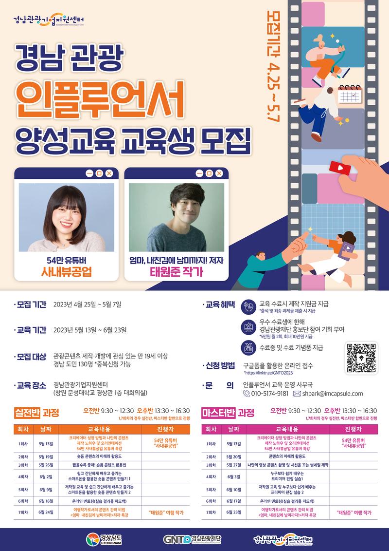 <경남 관광 디지털 전문인력 양성교육 인플루언서 수강생 모집> ○ 모집개요 - 경남 지역 관광콘텐츠 활용 전문가 육성을 위한「경남 관광 디지털 전문인력 양성교육」참가자를 모집합니다. 경남 관광 콘텐츠 기획·제작, 1인 미디어, 마케팅 또는 관광 분야 취업에 관심이 있는 분들의 많은 참여 바랍니다. ○ 기간 및 일정 - 모집기간: 2023.4.25.(화)\~5.7(일) - 수업일정: 2023.5.13.(토)\~6.23(금) (반별 일정 상이) * 인플루언서 실전반: 2023.5.13\~6.23, 매주 금요일 오전 9:30\~12:30/오후 1:30\~4:30(3시간), 7회차 * 인플루언서 마스터반: 2023.5.13\~6.23, 매주 토요일 오전 9:30\~12:30/오후 1:30\~4:30(3시간), 7회차 ○ 지원자격 - 경남도민, 도내 기업 또는 대학에 재직·재학 중인 자(외국인 포함) - 인플루언서 교육생 : 만 19세 이상 ○ 모집인원 - 인플루언서 실전반: 90명 (오전 45명, 오후 45명) - 인플루언서 마스터반: 40명 (오전 20명, 오후 20명) ○ 교육장소 - 창원문성대학교 경상관 1층 경남관광기업지원센터 대회의실 ※ 오리엔테이션 및 수료식은 경남대표도서관 또는 문성대학교 컨벤션홀 진행 예정 (별도안내) ○ 활동내용 - 인플루언서 과정 : 경남관광 활용 SNS 콘텐츠 제작, 영상편집 등 이론/실무 ○ 접수방법 - 구글 폼 제출(https://linktr.ee/GNTO2023) ○ 혜택내역 - 전 과정 무료 교육 - 교육 수료시 제작 지원금 지급 - 홍보단 참여 기회 부여(활동비 지급) *5만원 월 2회, 최대 10만원 지급 - 수료 요건을 충족한 자에 한하여 교육 수료증 발급 및 기념품 증정 - 반별 우수 수료생 대상 경남관광재단 대표이사 명의 상장 및 기념품 증정 ○ 유의사항 1. 마감시간(2023. 5. 7.(일))까지 구글폼으로 제출한 서류에 한하여 접수하며, 제출된 서류는 일체 반환하지 않음. 2. 참가신청서 기재 사항 누락 및 허위 기재 사실 확인 시, 신청자격 확인 서류 등 관련 서류 미제출 시에는 교육생으로 선정될 수 없음. 3. 관광마케터 교육 과정 및 인플루언서 교육 과정의 경우, 중복 신청 가능함. 단, 인플루언서 실전반 및 마스터반 중복 신청은 불가능함. 4. (저작권 귀속) - 교육시 제출한 결과물의 저작권은 원저작자에게 귀속되나, 경남관광재단은 공공목적을 달성하기 위한 범위 내에서 결과물을 활용할 수 있음. - 타인의 아이디어 모방 및 저작권을 침해하였을 경우 발생되는 모든 민ž형사상의 책임은 교육 결과물 제출자 본인에게 있음. 5. 기타 자세한 사항은 경남관광기업지원센터(055-277-8413)으로 문의 바람 ○ 문의 - ☏ 010-5174-9181 / shpark@imcapsule.com