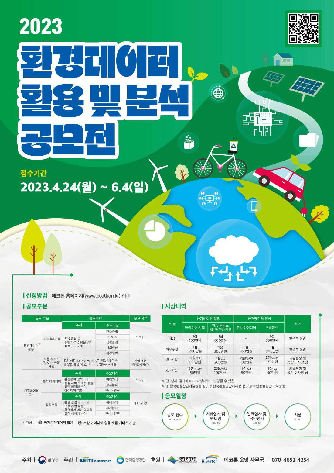 환경분야의 공공데이터와 민간데이터를 결합·활용한 민간의 창의적인 아이디어 및 신규 비즈니스 모델 발굴 지원, 환경 현안 해결을 위하여 본 공모전을 개최합니다.