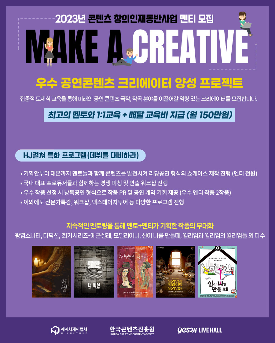안녕하세요 HJ컬쳐입니다. 2023년 콘텐츠 창의인재동반사업을 함께할 창의교육생(멘티)를 모집하고 있습니다. 공모요강, 신청서 등 자세한 내용은 HJ컬쳐 홈페이지(https://hjculture.com/forum/view/245843)에서 확인하실 수 있습니다.