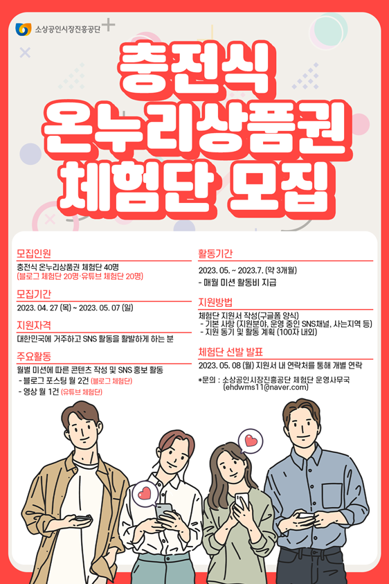소상공인의 큰 힘이 되는 소상공인시장진흥공단 충전식 온누리상품권 체험단 모집 ● 모집 대상 SNS 활동을 활발하게 하는 대한민국 국민 남녀노소 누구나 40명(유튜브 체험단 20명, 블로그 체험단 20명) ● 활동 내용 월별 미션에 따른 콘텐츠 작성 및 SNS 홍보 활동 - 활성화 목적 블로그 포스팅 월 2건 (블로그 체험단) - 사용의 생생함을 담은 영상 월 1건 (유튜브 체험단) 소상공인시장진흥공단 관련 행사 참여(선택) ● 모집 기간 모집기간 : 2023.04.27(목) \~ 05.07(일) 선발완료 : 2023.05.08(월) *추후 변동될 경우 별도의 공지를 드릴 예정입니다. ● 활동 기간 2023.05\~07(3개월 간) ● 활동 혜택 - 매월 소정의 활동비 및 취재비 지급 (관련해서 아래 메일로 문의주시면 답변드리겠습니다) ● 지원 방법 체험단 지원서 작성(하단 주소 클릭) https://naver.me/xD6Xopjc ● 발표 지원서 내 연락처를 통해 개별 연락 예정 ● 문의 사항 이메일 : ehdwms11@naver.com