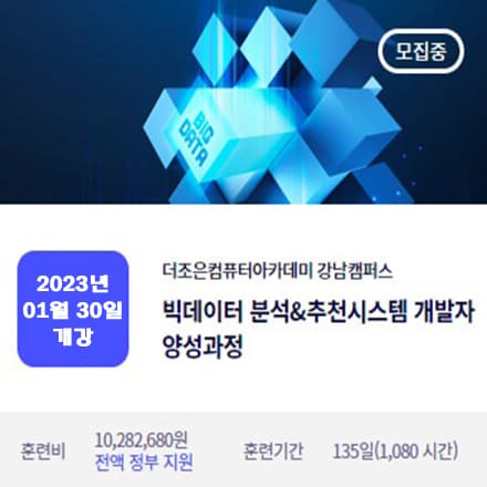 [더조은아카데미 - 강남캠퍼스] 훈련과정 - [K-Digital] 빅데이터분석 & 추천시스템 개발자 양성과정 교육일정 - 2023년 05월 16일 \~ 2023년 11월 28일 교육시간 - 10:00 \~ 18:40 (주5일 수업 / 일일 8시간) 교육비용 - 전액국비지원 교육문의 - 02-703-7025 / ocm7607@naver.com