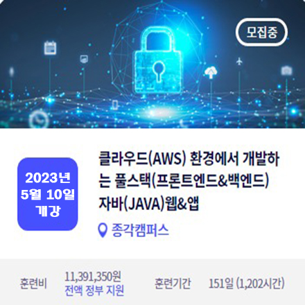 [더조은아카데미 - 종로점] 훈련과정 - [K-Digital] 풀스택(프론트엔드 & 백엔드) 자바(JAVA) 웹 & 앱 개발 전문가 과정 교육일정 - 2022년 05월 10일 \~ 2023년 12월 15일 교육시간 - 09:30 \~ 18:30 (주5일 수업 / 일일 8시간) 교육비용 - 전액국비지원 교육문의 - 02-703-7025 / ocm7607@naver.com