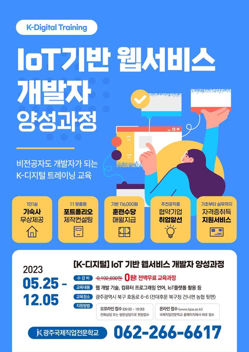 본 과정은 IoT 분야에 취업을 희망하는 구직자를 대상으로 아주 기초적인 기초 프로그래밍(코딩-C, 자바) 부터 Front-end, Back-end, IoT 오픈 플랫폼 활용 및 IoT 데이터 수집 변환, IoT 시스템 연동 SW, 실무 프로젝트, 현장실습 등으로 구성되어있어 IoT개발자, 웹개발자, IT개발자 등 다양한 4차산업 분야에 취업할 수 있도록 훈련하는 과정이며, 훈련생 본인의 의지에 따라 정보처리기사(산업기사, 기능사) 자격을 취득할 수 있도록 지원하는 교육과정입니다.