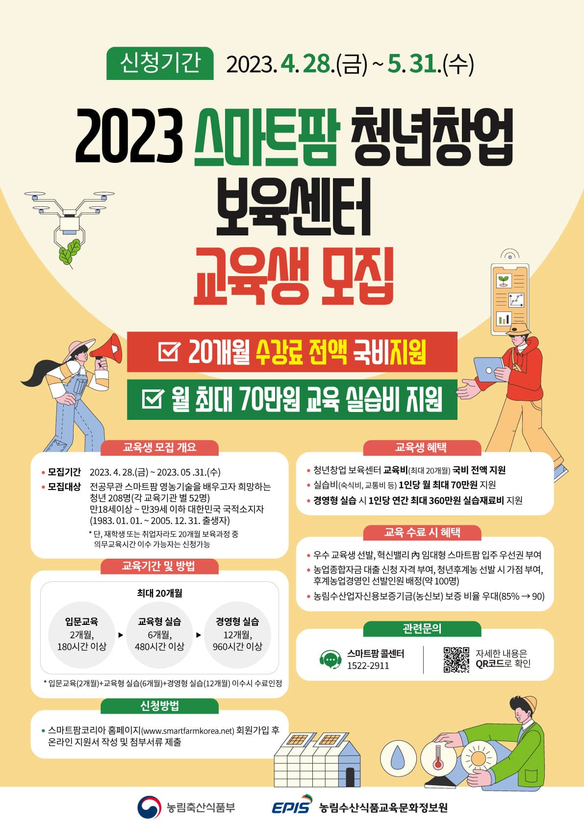 제목 2023 스마트팜 청년창업 보육센터 교육생 모집 ○ 공모개요 - 스마트팜 영농기술 교육 ○ 기간 및 일정 - 23.04.28\~23.05.31 ○ 모집인원 - 208명 ○ 참가비용 유무 - 국비지원 무료 ○ 지원자격 - (+졸업생 가능여부) : 전공무관 / 만 18세 이상 \~ 만 39세 이하 대한민국 국적 소지자 ○ 접수방법 - 홈페이지 접수 (스마트팜코리아 (smartfarmkorea.net)) ○ 교육과정 - 입문 과정 (2개월) / 교육형 실습 (6개월) / 경영형 실습 (12개월) ○ 활동혜택 - 실습비 지원, 영농 기술 지도 및 컨설팅 지원- 수료생 대상 청년 스마트팜 종합자금 대출 신청자격 부여, 청년후계농 선발시 가점 부여, 후계농업경영인 선발인원 배정(100명), 농림수산업자신용보증기금 보증 비율 우대 등