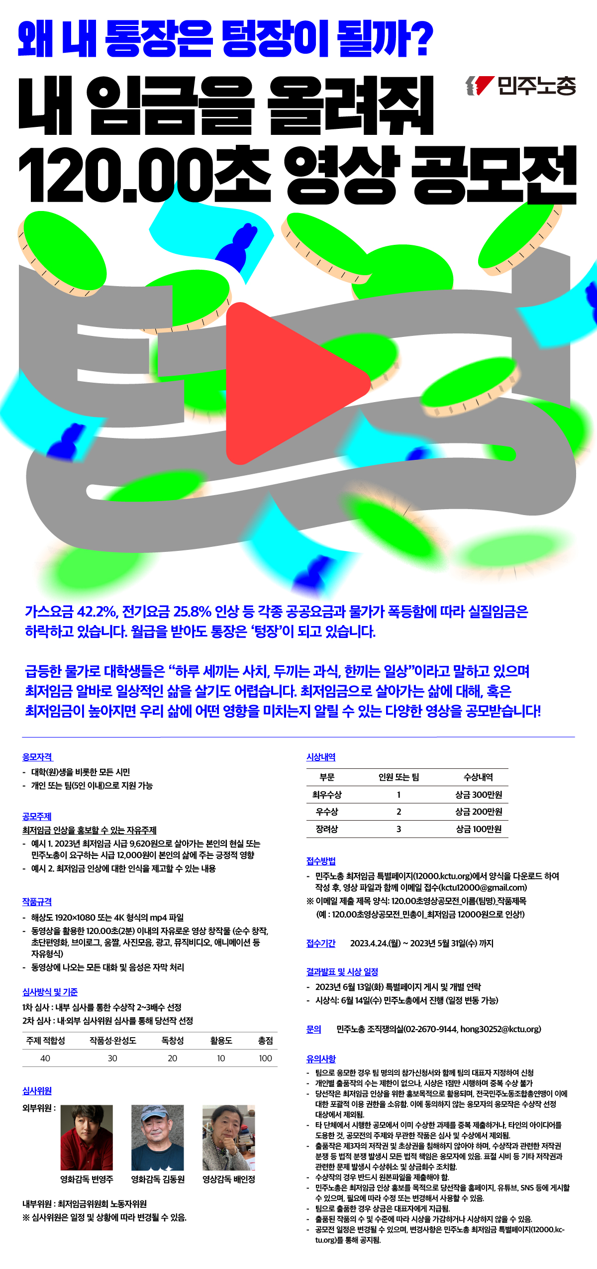○ 공모전 명칭 : 왜 내 통장은 텅장이 될까? 내 임금을 올려줘 120.00초 영상 공모전