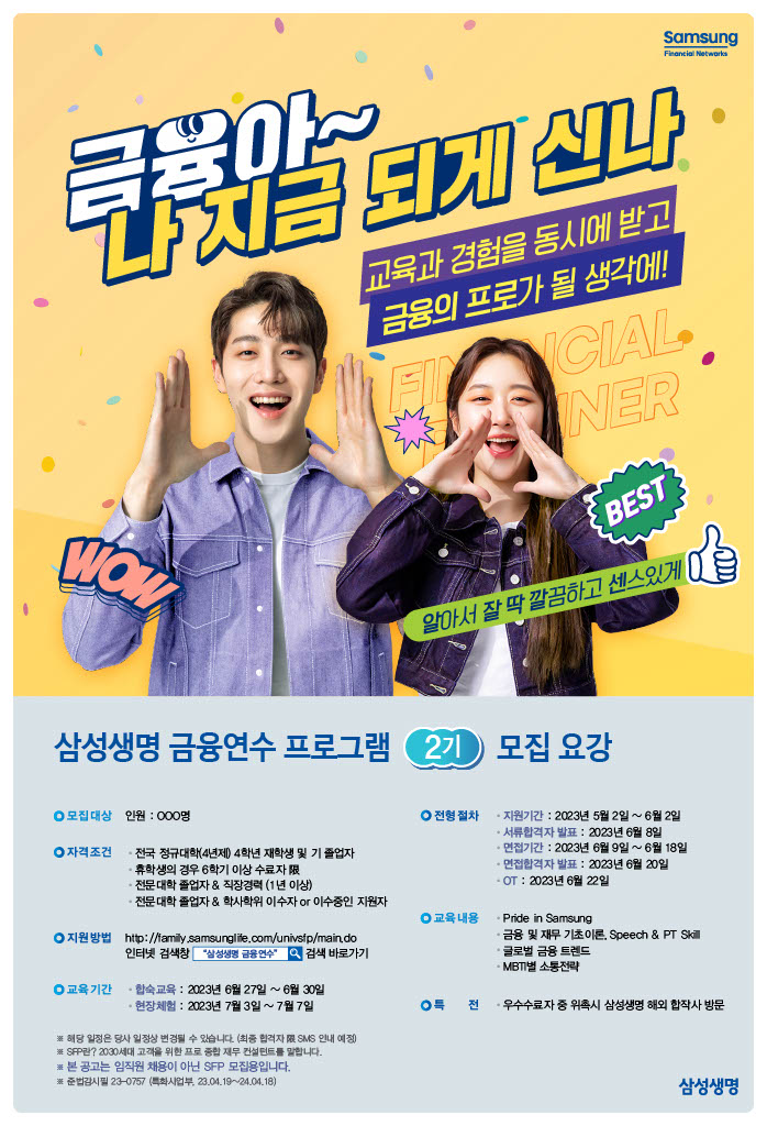 삼성 금융연수 프로그램2기가 금융권의 취업을 희망하시는 모든 분들을 위해 부산에서 개최됩니다! 많은 참여와 관심 부탁드립니다\~! 모집인원 : 00명 자격요건 - 전국 정규대학(4년제) 4학년 재학생 및 기 졸업자 - 휴학생일 경우 6학기 이상 수료자 - 전문대학 졸업자 & 직장경력 1년 이상 - 전문대학 졸업자 & 학사학위 이수자 or 이수중인 지원자 전형일시 - 지원기간 : 2023/05/02\~2023/06/02 - 서류합격자 발표 : 2023/06/08 - 면접기간 : 2023/06/09\~2023/06/18 - 면접 합격자 발표 : 2023/06/20 - OT : 2023/06/22 교육내용 - Pride in SAMSUNG - 금융 및 재무 기초이론\, Speech & PT Skill - 글로벌 금융 트렌드 - MBTI별 소통전략 교육기간 - 합숙교육 : 2023/06/27\~2023/06/30 - 현장체험 : 2023/07/03\~2023/07/07 특전 - 우수수료자 중 위촉 시 삼성 해외 합작사 방문 신청방법 https://forms.gle/mKm341SoEhNofj5UA 구글폼 양식 작성 후 담당 멘토가 연락 드립니다. 멘토추천전형제라 서류지원접수 및 지원용 자소서 첨삭 도와드릴 예정입니다. 문의사항 010-7582-3765
