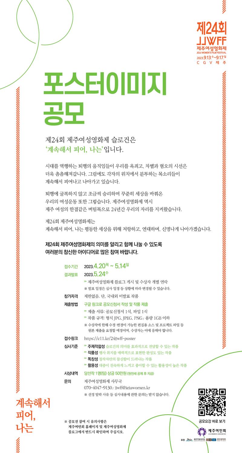 제24회 제주여성영화제는 ‘계속해서 피어, 나는’이라는 주제로 9월 13일(수) \~ 9월 17일(일) 진행합니다. 제주씨네페미학교, 요망진당선작(단편경선)공모, 제주지역작품 초청 공모, 집담회 및 포럼 등 다양한 섹션을 꾸려 최근 한국사회를 뜨겁게 달구었던 이슈를 여성영화를 통해 만날 수 있는 장을 마련하겠습니다. 제24회 제주여성영화제의 의미를 알리고, 함께 나눌 수 있도록 여러분의 참신한 아이디어로 많은 참여 바랍니다.