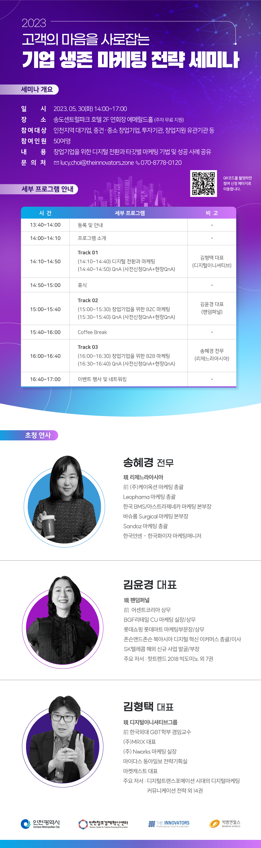 2023 기업 생존 마케팅 전략 세미나 □ 세미나 개요 ◦ 일 시 : 2023. 05. 30(화) 14:00\~17:00 ◦ 장 소 : 송도센트럴파크 호텔 2F 연회장 에메랄드홀 (주차 무료 지원) ◦ 참여대상 : 인천지역 대기업, 중견중소 창업기업, 투자기관, 창업지원 유관기관 등 ◦ 내 용 : 창업기업을 위한 디지털 전환과 타깃별 마케팅 기법 및 성공 사례 공유 □ 세부 프로그램 안내