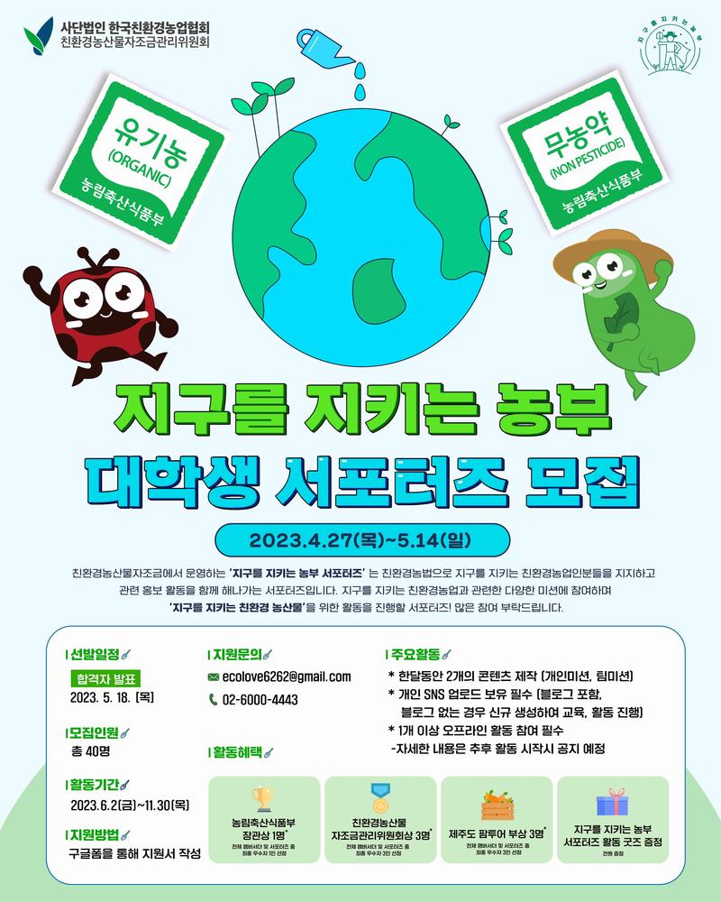 지구를 지키는 농부 서포터즈 2기 대학생 모집(\~5.14) 친환경농산물자조금관리위원회에서 '지구를 지키는 농부 서포터즈 2기'로 활동할 대학생을 모집합니다! 지구를 지키는 다양한 미션에 참여하며 '지구를 지키는 친환경농산물'을 통해 지구를 지키는 일에 앞장서서 활동할 서포터즈! 지구를 지키는 선한 영향력을 널리 퍼트릴 대학생 여러분의 많은 참여를 기다립니다! ●모집 인원 - 총 40명 ●모집 기간 - 2023. 4. 27(목) \~ 5. 14(일) ●합격 발표 - 2023. 5. 18.(목) ●활동 내용 - 월별 미션 진행 : 한 달 동안 2개의 콘텐츠 제작 미션(개인미션\,팀미션) *개인 sns 업로드 보유 필수 *1개 이상 오프라인 활동 참여 필수 *블로그가 없는 경우에는 신규 생성해서 활동 가능 *필수 해시태그 및 자세한 내용은 추후 활동 시작 시 공지 예정 ●활동 기간 - 팀원들과 함께 ‘환경 친목 활동'을 할 수 있는 기회 - <지구를 지키는 농부 서포터즈> 활동 물품 제공 - 농림축산식품부 장관상 1명 (전체 앰버서더 및 서포터즈 중 내부 심사를 통해 최종 1인 선정) - 친환경농산물 자조금관리위원회상 3명 (전체 앰버서더 및 서포터즈 중 내부 심사를 통해 최종 3인 선정) - 제주도 팜투어 부상 3명 (전체 앰버서더 및 서포터즈 중 내부 심사를 통해 최종 3인 선정) - 무엇보다 친환경적인 활동으로 지구를 지킨다는 마음속의 뿌듯함 획득 ●접수 방법 - 구글 폼 링크를 통해 서포터즈 지원을 완료해주세요! https://bit.ly/3VeGnpi ●문의 - 지구를 지키는 농부 서포터즈 운영사무국 (02-6000-4443 / ecolove6262@gmail.com)