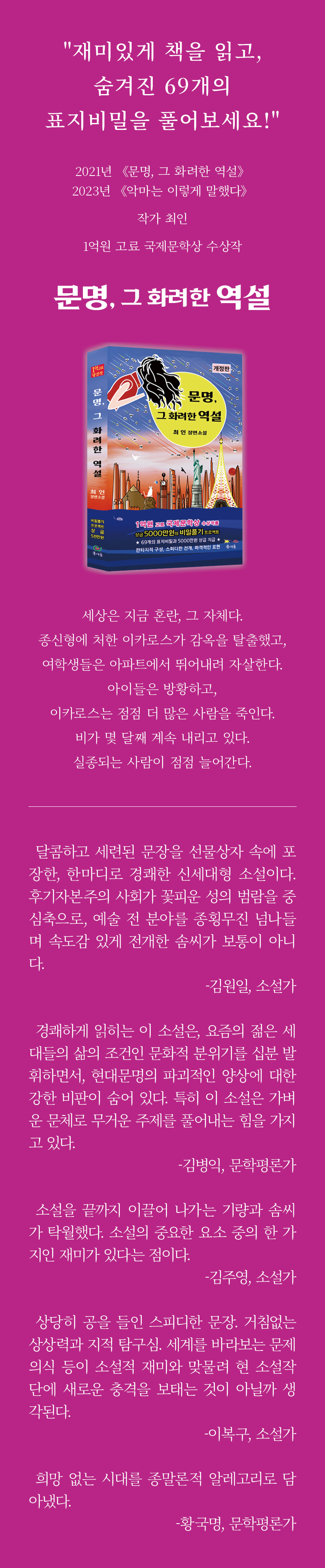 * 비밀은 개인, 연인, 커플, 모임, 단체도 풀 수 있으며, 서로 정보를 교환할 수 있습니다. * 초판본을 구매한 독자도 개정판의 규칙을 적용해 비밀을 풀고 상금을 받을 수 있습니다. * 연인이나 커플, 부부가 도전할 경우 비밀 3개를 면제해 드립니다. * 비밀풀기는 비밀을 푸는 사람이 나올 때까지 계속됩니다. ■ 응모자격 개인, 연인, 커플, 모임, 단체 누구나 할 수 있습니다. ■ 응모방법 《문명, 그 화려한 역설》을 읽고 표지에 숨겨진 69개의 비밀을 풀어 홈페이지/이메일에 응모합니다. ■ 일정 비밀 풀기에 도전한 독자는 매 짝수월에 1회, 말일까지 도서출판 글여울 홈페이지/이메일에 해답을 제출할 수 있습니다. (2월, 4월, 6월, 8월, 10월, 12월 31일까지) ■ 규격 해답은 10자〜50자 이내로 씁니다. (긴 문장이 필요한 경우 글자 수를 초과할 수 있습니다.) 답 앞에는 반드시 일련번호를 붙여야 합니다. (1에서 69까지) ■ 심사 2개월에 한번 3일간 실시해 결과를 도서출판 글여울 등에 게시합니다. (당첨자 개별통보) 상금 수령 시 《문명, 그 화려한 역설》 개정판 또는 초판 1부와 신분증을 제시해야 합니다. ■ 비밀의 보관 및 개봉 비밀은 현재 봉인된 상태로 금고에 보관 중입니다. 비밀의 개봉은 비밀이 풀렸을 때 이루어집니다. 심사는 봉인된 비밀의 사본으로 실시합니다. ■ 책소개 제목 : 문명, 그 화려한 역설|개정판 부제목 : 상금 5000만원과 69개의 표지비밀 풀기 프로젝트 저자 : 최인 쪽수 : 497p 10% 할인가 : 16,200원 (정가 : 18,000원) |왜곡된 현대문명에 대한 묵시록적 기록 |가벼운 문체로 무거운 주제를 풀어내는 힘 |달콤하고 세련된 문장을 선물상자 속에 포장한 소설 세상은 지금 혼란, 그 자체다. 종신형에 처한 이카로스가 감옥을 탈출하고, 여학생들은 아파트에서 뛰어내려 자살한다. 아이들은 방황하고, 이카로스는 더 많은 사람을 죽인다. 비가 몇 달째 계속 내리고 있다. 예수의 지하부는 물에 잠겨 가고, 실종되는 사람이 점점 늘어간다. 더 얇고, 더 가볍고, 더 쉽게. 짜릿하고, 새롭고, 파격적이다. 스피디한 문체와 흥미진진한 스토리 ■ 저자 최 인 (본명 최인호) 1982년-1996년 인천경찰청 근무. 파출소장, 형사반장 역임. 1998년 동아일보 신춘문예 단편 「비어있는 방」으로 등단. 2002년 1억원고료 국제문학상 수상. 「문명, 그 화려한 역설」 2008년-2019년 <최인 소설교실> 운영. 2020년 <도서출판 글여울> 창립 ■ 저자의 작품 문명, 그 화려한 역설(2021), 도피와 회귀(2021), 돌고래의 신화(2022/단편집), 악마는 이렇게 말했다(2023), 문명, 그 화려한 역설(2023/개정판) ■ 참고 글여울 홈페이지 https://www.glyeoul.com 비밀풀기 이메일 secret_project@naver.com * 《문명 그 화려한 역설|개정판》은 교보문고, 알라딘, 예스24, 글여울 스토어에서 만나보실 수 있습니다. ■ 문의 전화번호 070-8704-0829