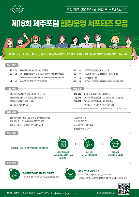 제주특별자치도] 제18회 제주포럼 현장운영 서포터즈 모집(\~5/3) 1. 모집인원: 00명 2. 모집 분야: 안내, 영접, 등록, 회의 운영지원 등 3. 근무 기간 - 사전 교육 : 2023년 5월 30일(화), 16시\~18시 - 근무 일정 : 2023년 5월 31일(수) – 6월 2일(금) , 9시\~18시 4. 근무 조건 - 만19세 이상 대학생 및 졸업생, 대학원생 등 외국어(영) 가능자 우대 - 국제회의 및 MICE 행사 기회를 경험하고 싶은 자 5. 급여: 시급 10,000원 * 사전교육 참석자, 사전교육비 지급 (40,000원) * 행사 진행 상황에 따라 근무 시간과 근무 수당이 변동될 수 있습니다. * 중식 및 간단한 간식 제공 (교통비 및 숙박비는 지원되지 않습니다.) * 19시 이후 근무자, 추가수당 지급 및 석식 제공 6. 근무복장 - 유니폼 지급 (카라티) 1복 * 사전 교육일에는 편한 복장 착용 7. 문의 - jejuforum.hr@gmail.com - 064 735 1034