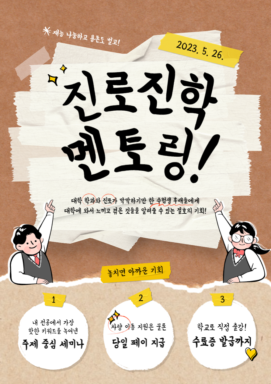 중·고등학생들이 듣는 특강이기 때문에 너무 심도 깊은 내용은 다루지 않아도 되며, 대학교 1학년 첫 전공 수업 오리엔테이션 정도의 수준으로 진행하셔도 충분하니 부담가지실 필요는 없습니다.아래는 5월 26일 진행 예정인 충북 청주 소재 고등학교 대상 대학생 멘토 모집 내용입니다. 많은 관심과 참여 부탁드리겠습니다.