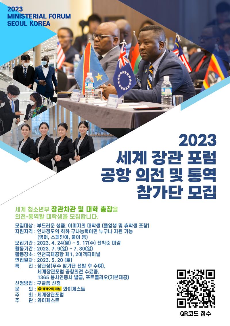 2023 세계 장관 포럼 공항 의전 및 통역 참가단 모집 ❍ 모집 기간 : 2023. 4. 24(월) \~ 5. 17.(수) 선착순 마감 ❍ 모집 대상 : 부드러운 성품과 이미지의 대학생(휴학생 및 졸업생 포함) ❍ 모집 자격 : 인사정도의 회화 구사능력이면 누구나 지원 가능(영어, 스페인어, 불어 등) ❍ 활동비 : 3만원(식대 및 카드 명찰 및 단체티) ❍ 신청 방법 : 구글폼 접수, 큐알코드 접수(https://forms.gle/yD7VMWPvgze4g3nN7) ❍ 서류 심사 합격자 결과 발표(5월 20일) * 서류 심사 합격자에게 면접 장소 및 일정 공지 ❍ 서류 심사 합격자를 대상으로 면접 심사 실시(5월 20일) ❍ 최종 합격자 발표(5월 21일) ❍ 선발된 의전・통역요원은 소양·직무교육, 현장 운영교육 총 3회(날짜는 추후 공지 예정) ❍ 최종 선발 후 결격 사유 해당 시 즉시 불합격 처리 ❍ 활동 기간은 포럼 기간 포함 7월 9일 \~ 7월 30일 * 활동 기간 및 시간은 70여개국의 장관, 차관 및 대학 총장 등의 스케줄에 따라 추후 변경될 수 있음 ■ 혜택 ❍ 장관상 * 참가단 활동 종료 후, 우수 참가단을 선발하여 국회의원상, 장관상 수여 ❍ 장관, 차관 및 대학 총장 등 귀빈 의전 기회 제공 ❍ 세계청소년부 장관포럼 공항의전 수료증 발급, 포트폴리오 제공, 1365 봉사인증서 발급(기본 제공) ■ 참고 사항 ❍ 3회 이상 참석시 수료증 및 카드 명찰 제공 ❍ 문의 : 참가단 팀장 010-9215-7362, 인사팀장 010-5711-5324 카카오톡채널(와이제스트)- http://pf.kakao.com/_xbpruxj